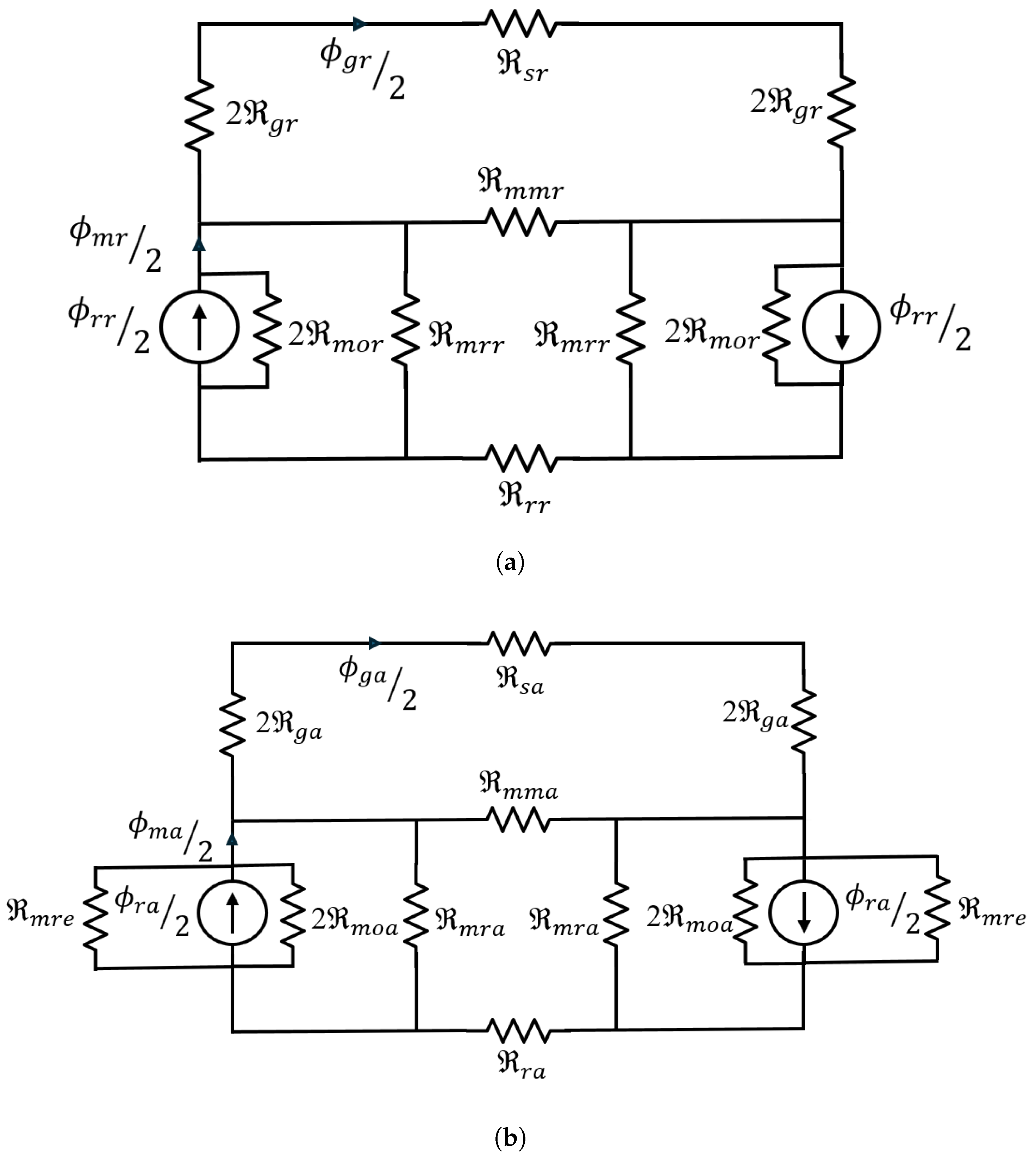 Figure 9a illustrates the MEC of the conventional PMSM, where the magnetization direction of the PMs is radial. In the proposed structure, an additional rotor with the PMs magnetized axially is introduced. This axial magnetization reduces the effective air gap compared to the conventional overhang design. The MEC model of the proposed structure is presented in this section and is depicted in