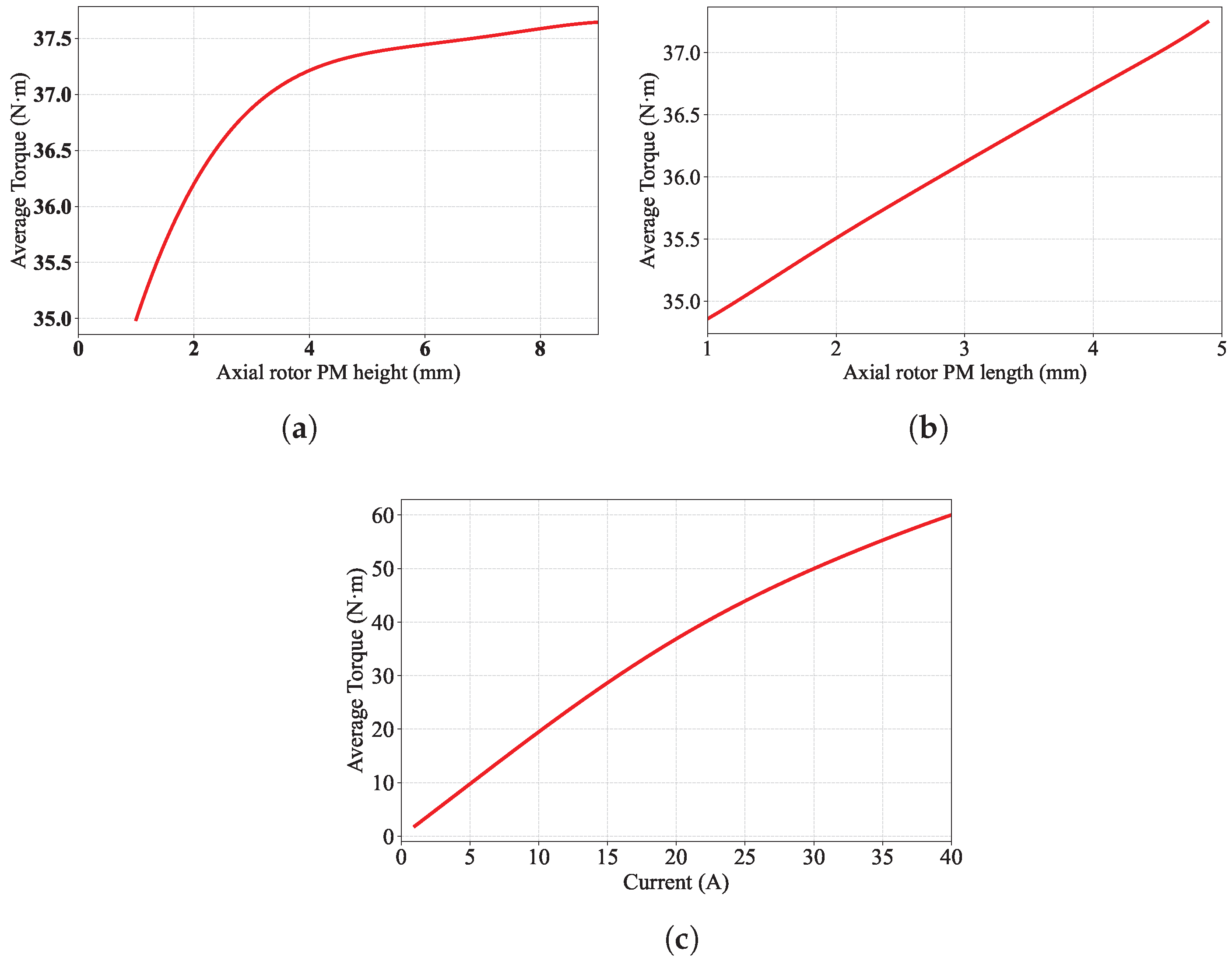 (a) Torque versus axial rotor PM height; (b) torque versus axial rotor PM length; (c) torque versus current.