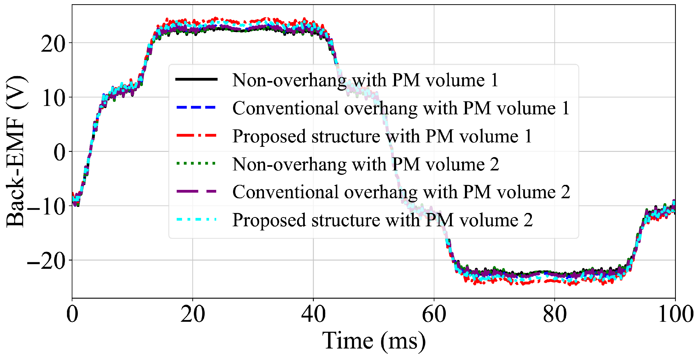 Back-EMF comparison of the proposed structure with the conventional PM overhang and non-overhang configurations.