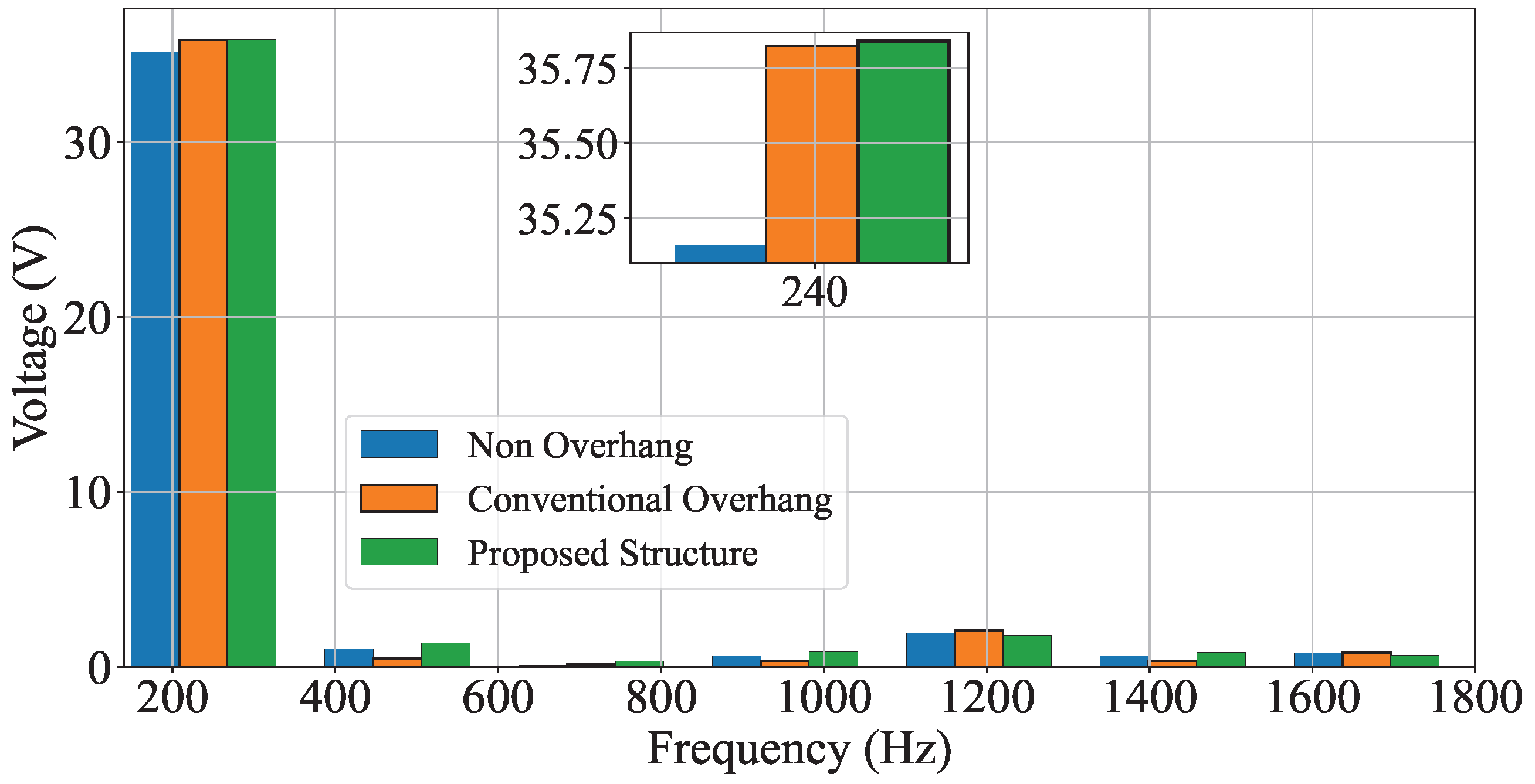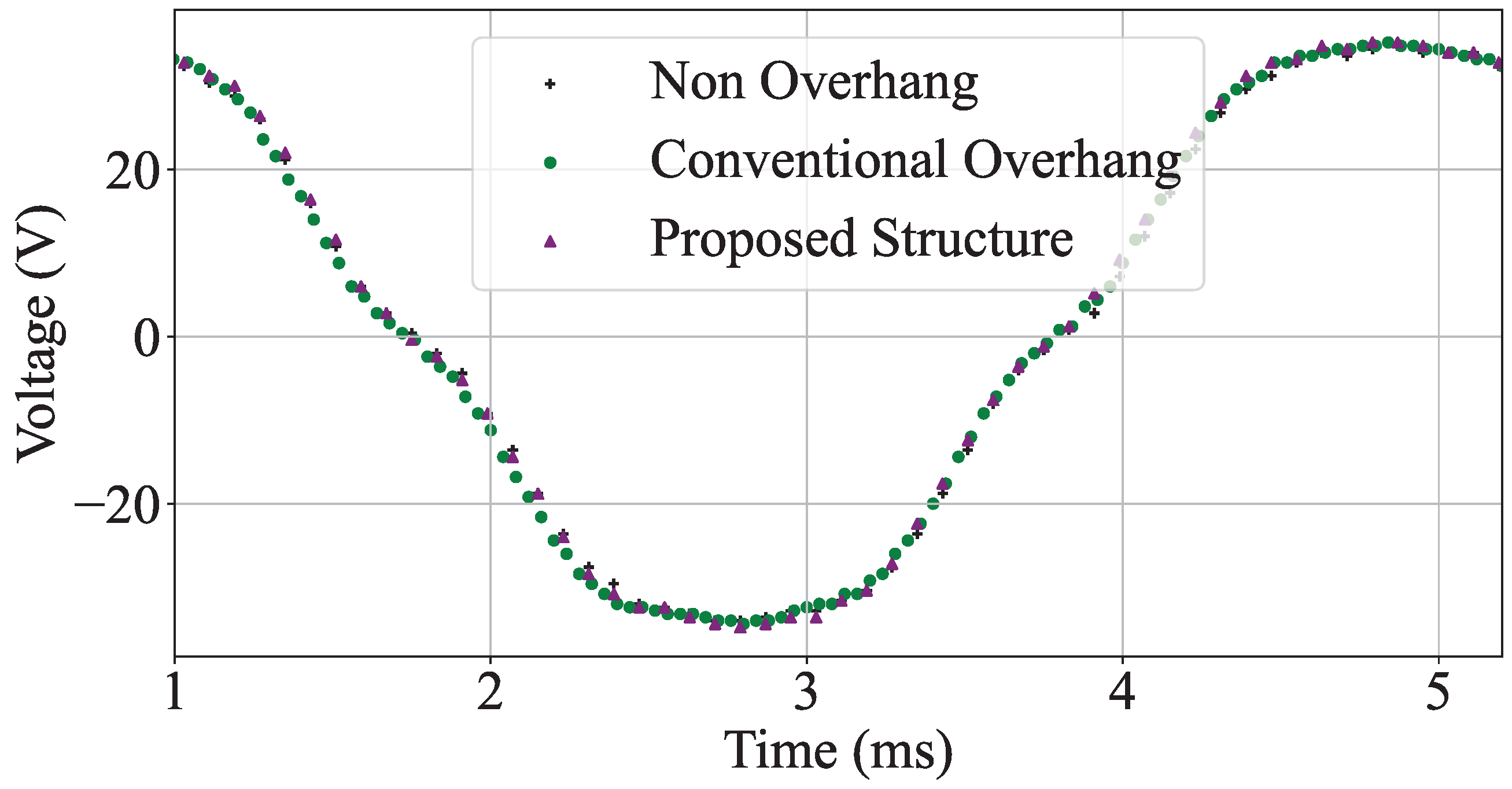 Voltage comparison between the conventional overhang, non-overhang, and proposed structure.
