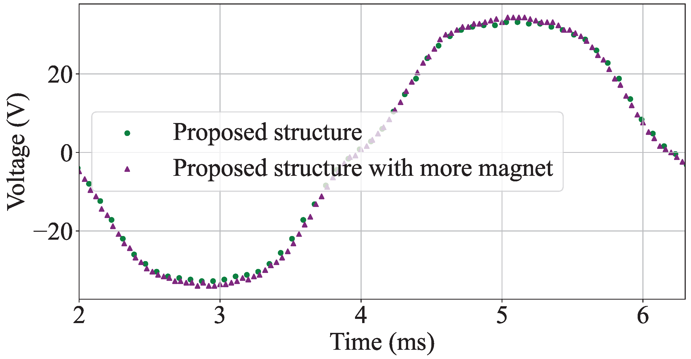 Figure 5, by comparing the magnetic field at the edge of the stack length in the air gap for the non-overhang structure and the proposed structure, it is observed that the magnetic field is extended in the proposed design. This extension of the magnetic field results in an increase in the induced voltage.