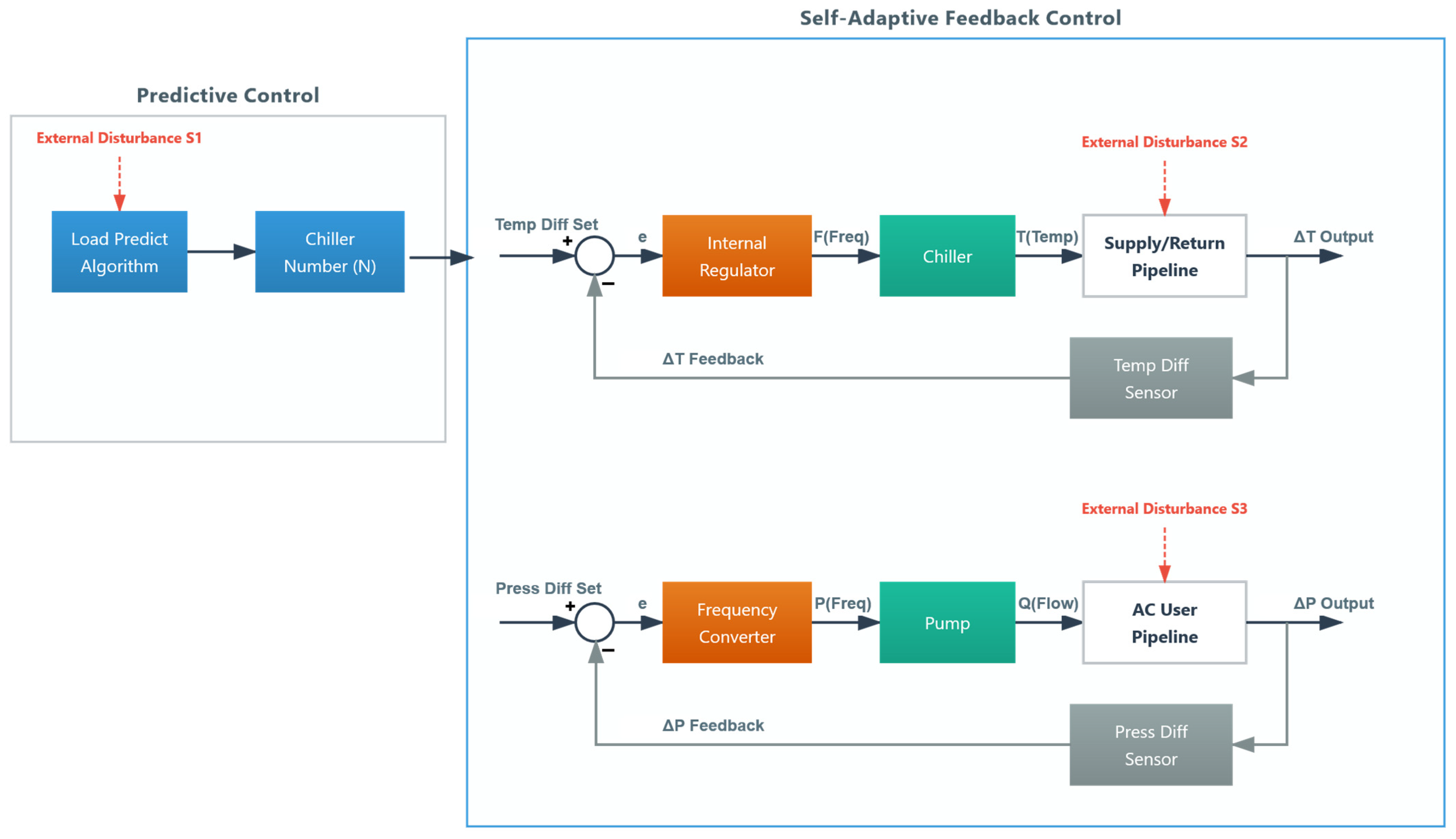Self-Adaptive Feedback Control: Once the units are operational, the feedback loop continuously modulates the supply water temperature set-point () and pump speed () to eliminate the residual error between the predicted state and the actual building demand, ensuring precise load matching.