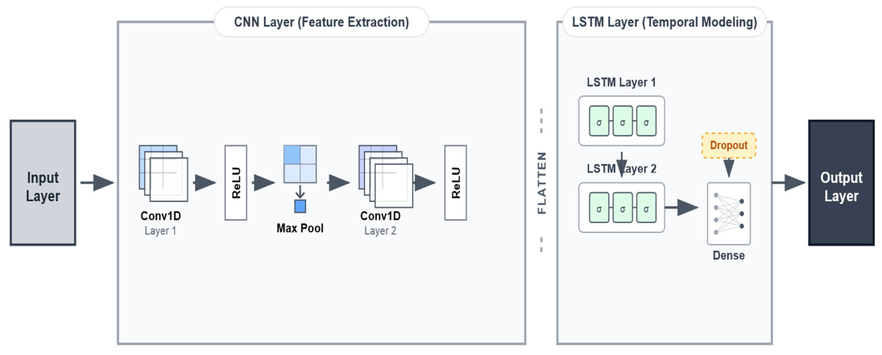 The feature vectors extracted by the CNN are fed into the LSTM layer. The LSTM unit handles the vanishing gradient problem common in standard RNNs using three gates: the forget gate (