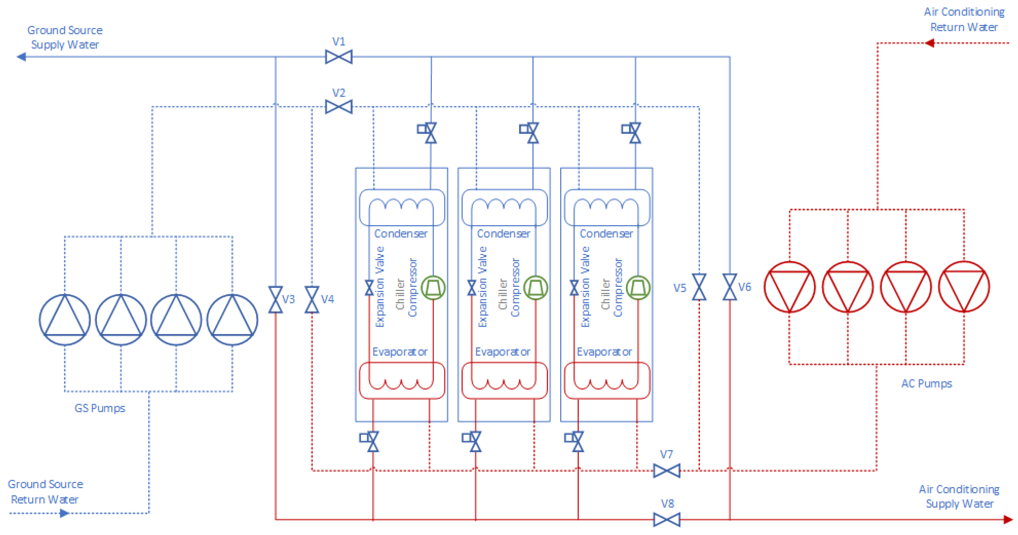 Geothermal resources are a clean energy source, and ground source heat pump systems have become a common form of HVAC systems, fully leveraging energy conservation and economic benefits. However, the application of “Large-Scale” GSHP systems—defined in this context as centralized, district-level energy stations with capacities exceeding 100 kW and serving multiple building blocks or distinct functional zones—introduces unique operational risks. System control methods and strategies play a crucial role in improving system efficiency, reducing energy consumption, and maintaining system balance [