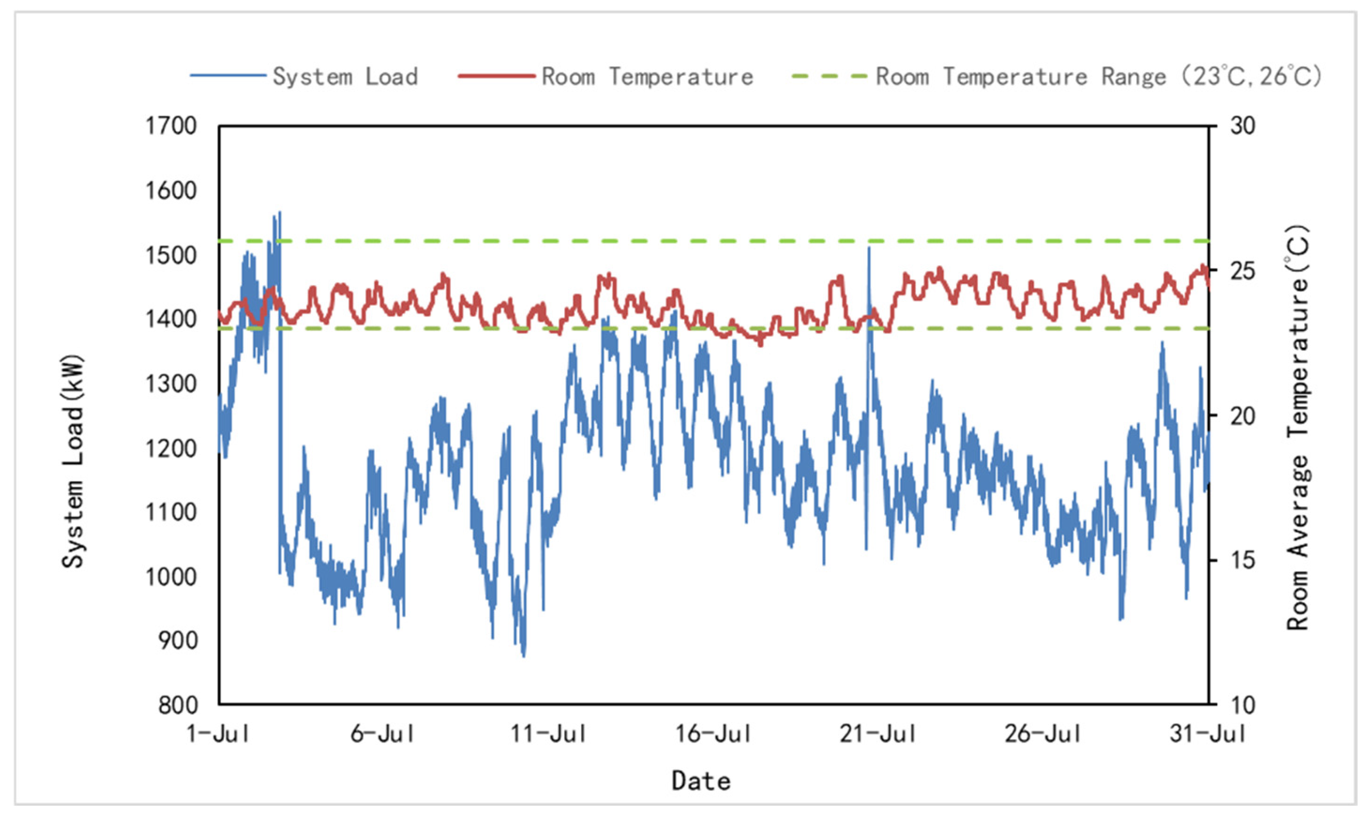 Figure 5, despite the system load fluctuating violently between 876 kW and 1565 kW (a variance of nearly 80%) due to weather and occupancy changes, the indoor average temperature was tightly regulated between 23 °C and 26 °C.