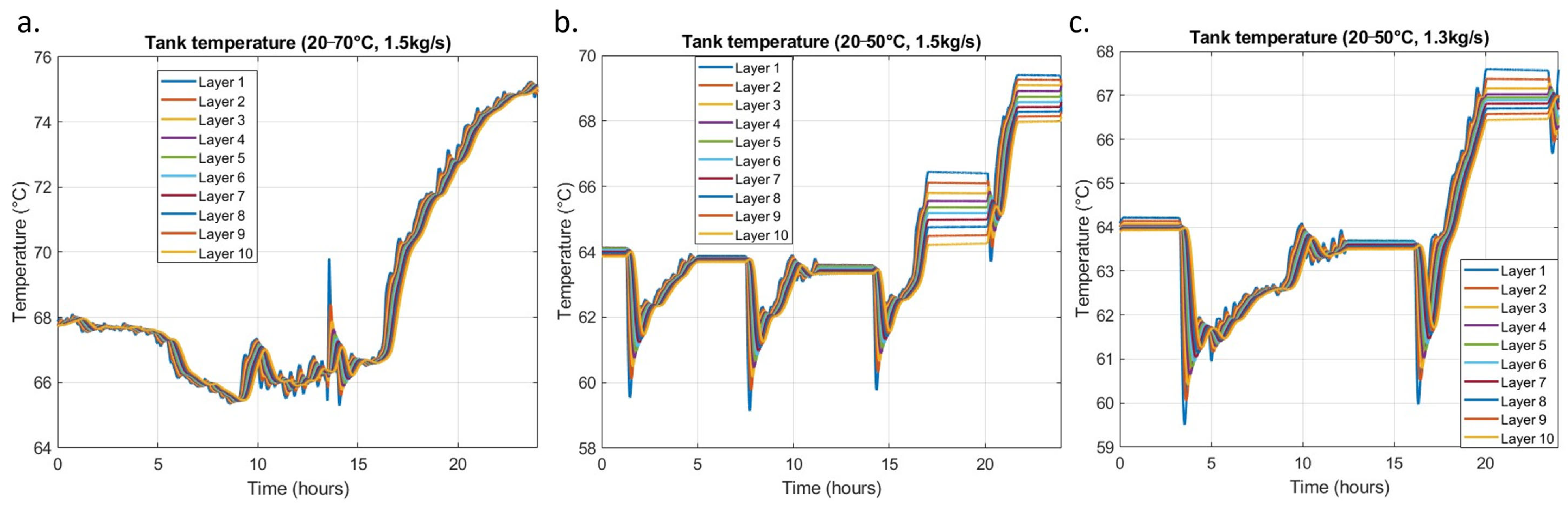 - a control-oriented evaluation of hysteresis-based strategies (baseline) quantifying energy use, stratification, and cycling frequency, providing a reference for future MPC design.