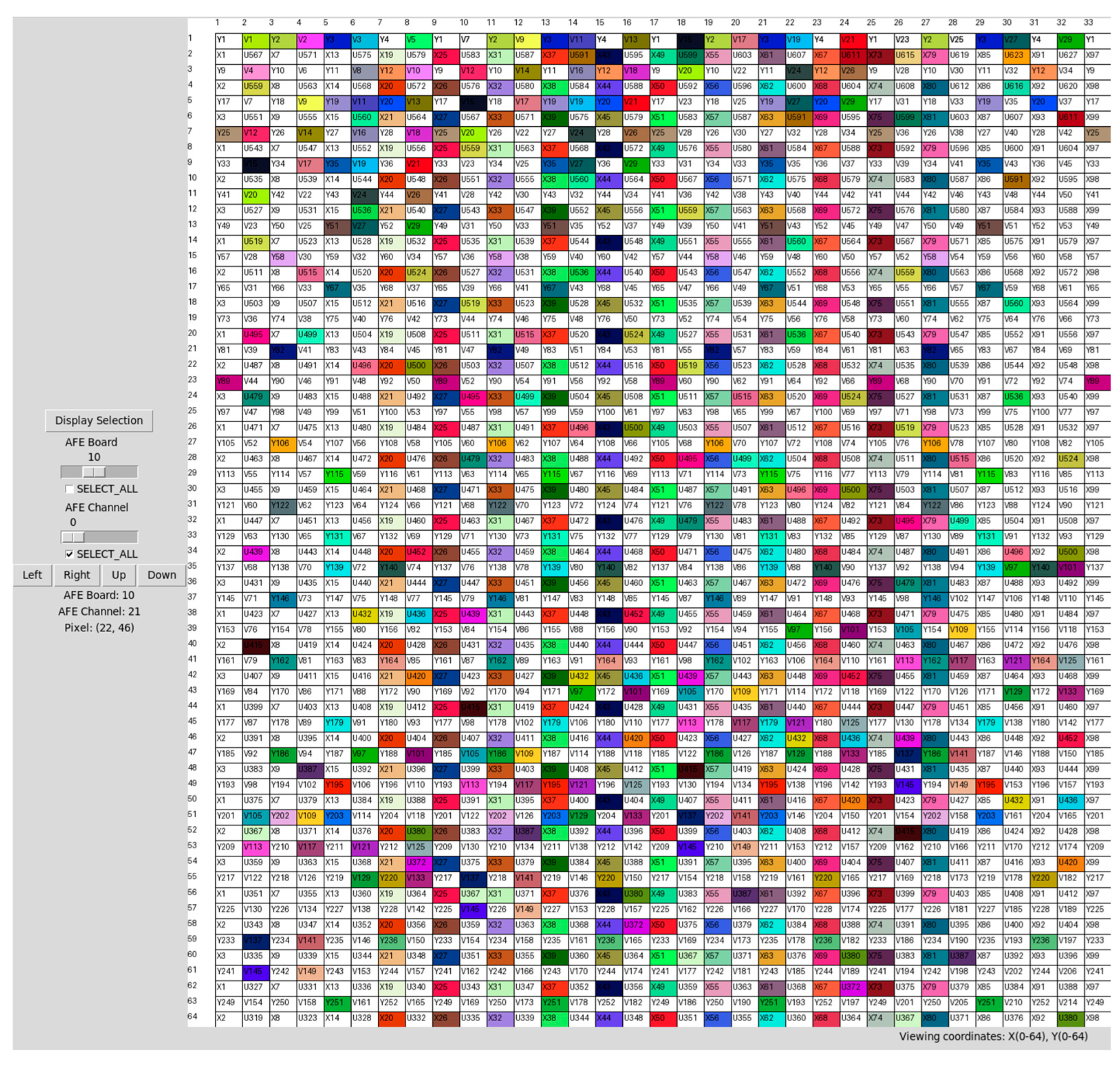 - Readout coordinates: Selection of the optimal coordinate system of the pixels, such as X, XY, XYU, XYUV, etc.—more dimensions require more interconnections between FPGAs.