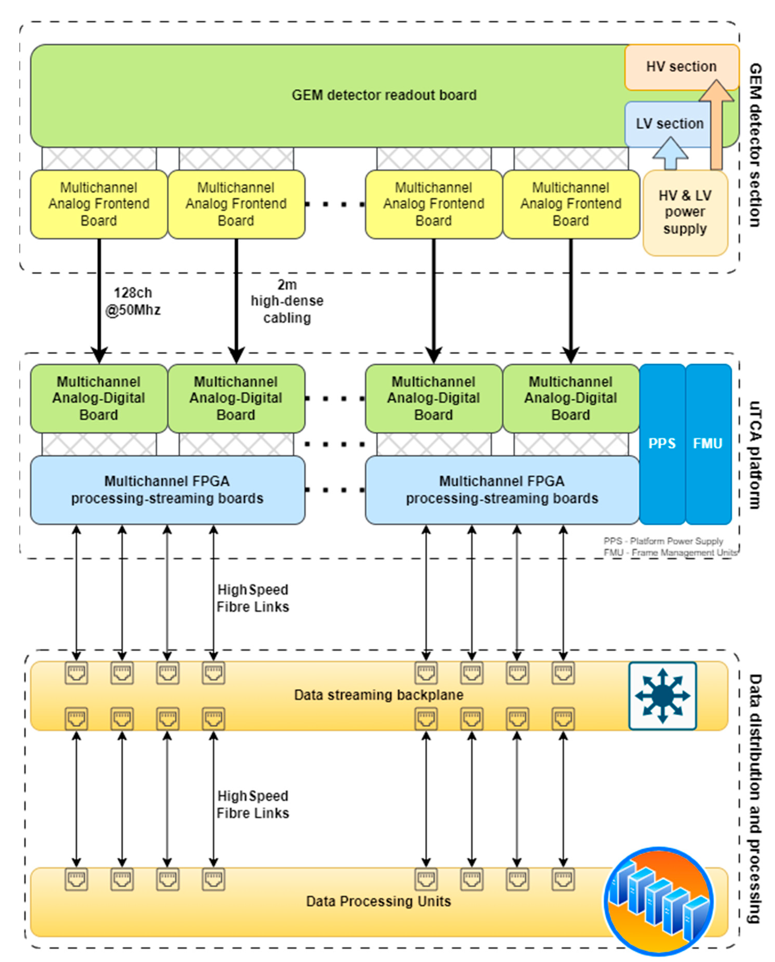 - High-speed backplane supporting various data streaming configurationsWithin the GEM3k system implementation it provides connections for output data streaming, including Rear-Transition Modules (RTMs), for external data distribution at high bandwidths.