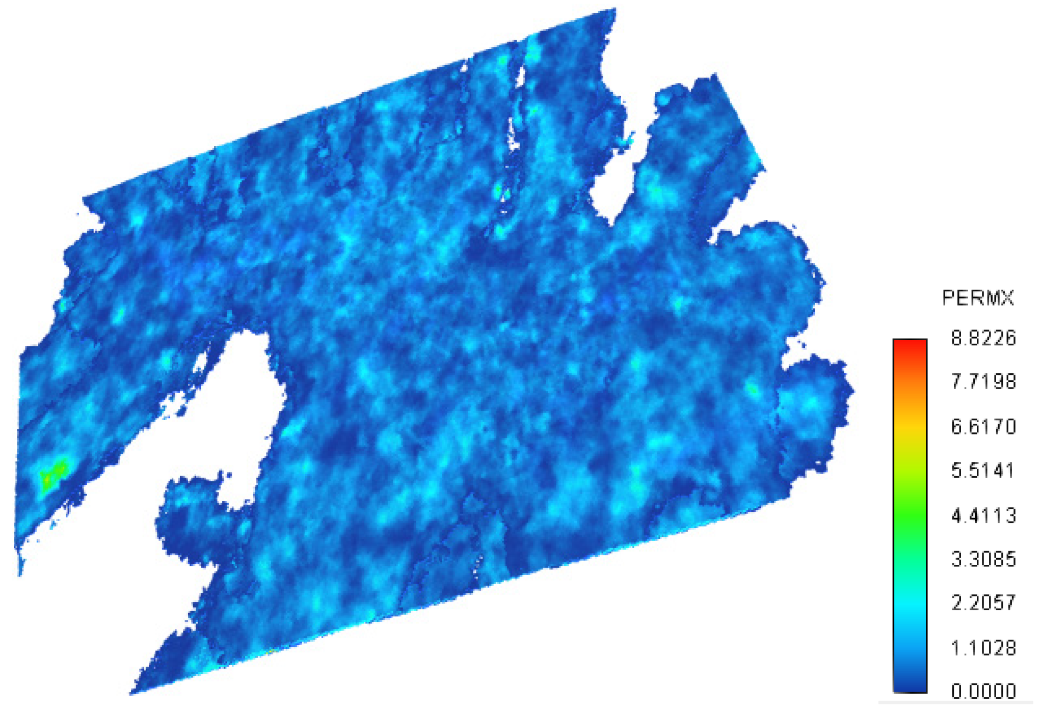 The reservoir model has 1,312,830 (503 × 435 × 6) grids and 478 wells. The permeability distribution in the X direction and some properties of the reservoir are shown in