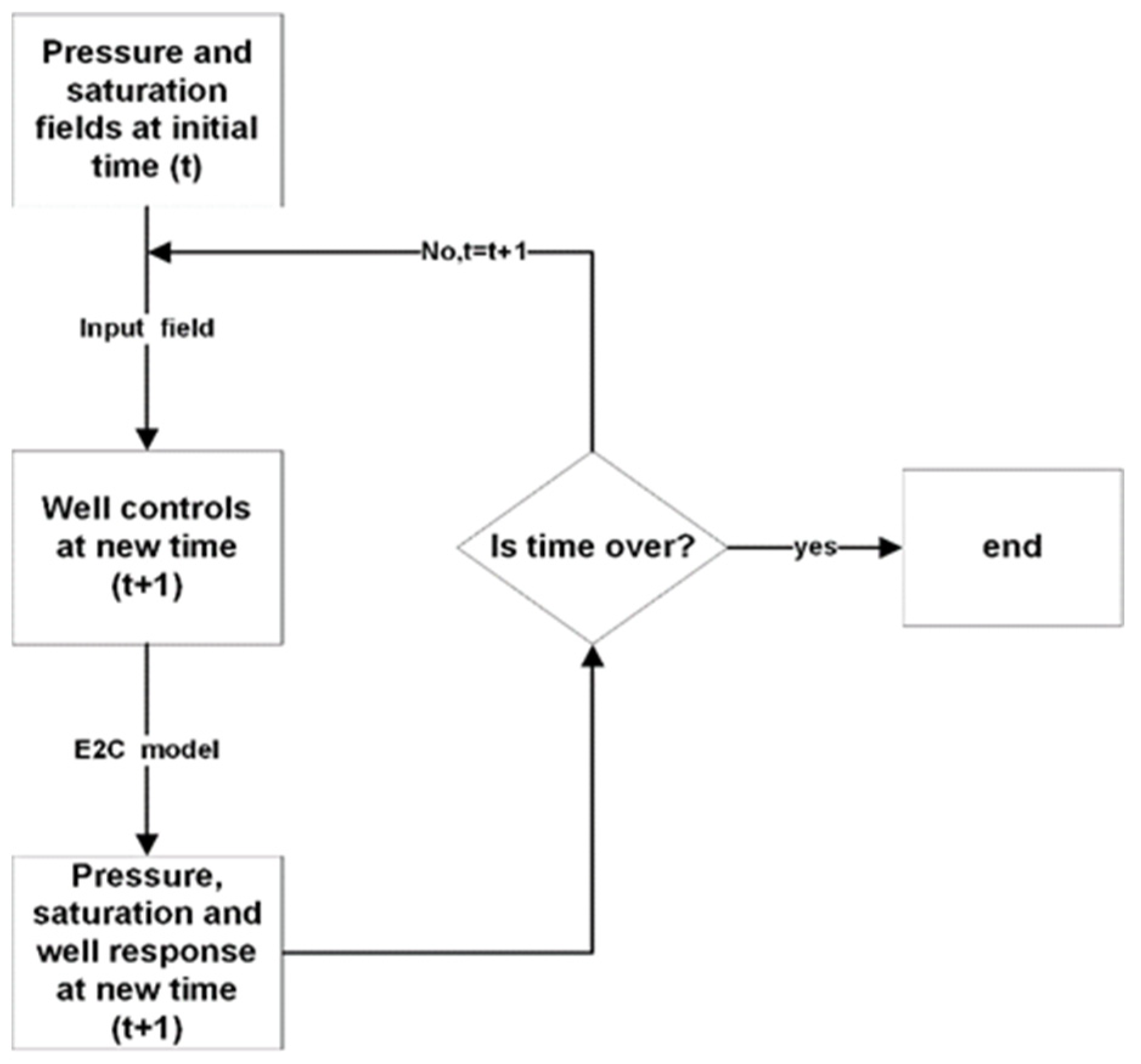 27] constructed an end-to-end model based on E2C to realize the prediction of production with the changing control conditions of wells in the reservoir. Firstly, the model uses an AE encoder to reduce the dimension of the input data and extract features; then, according to the control conditions of wells, the fully connected converter is used to obtain new features; finally, the distributions of saturation and pressure at the new time are obtained by the decoder. Although the E2C model proposed by Jin et al. works well in simple reservoirs, it is poor in accuracy in large-scale reservoirs and cannot give production information directly. Qin F. et al. (2022) [