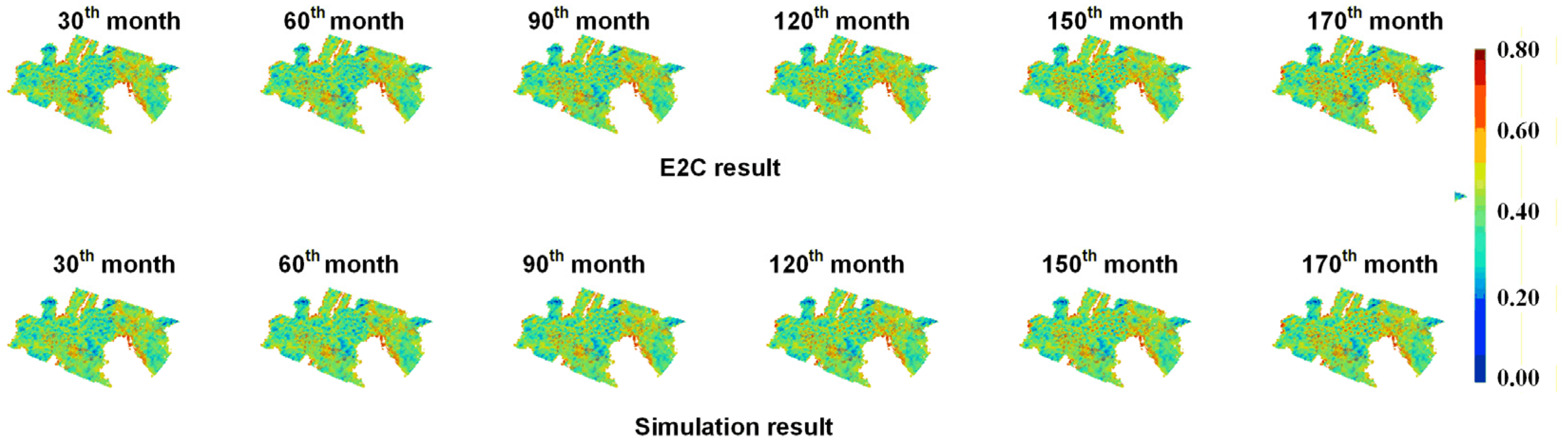 Firstly, based on the pressure and saturation on 1 December 2004, changes in the reservoir at each month in the 172 months were predicted in turn according to the control conditions in the corresponding months. Then, the performance of the E2C model was analyzed.