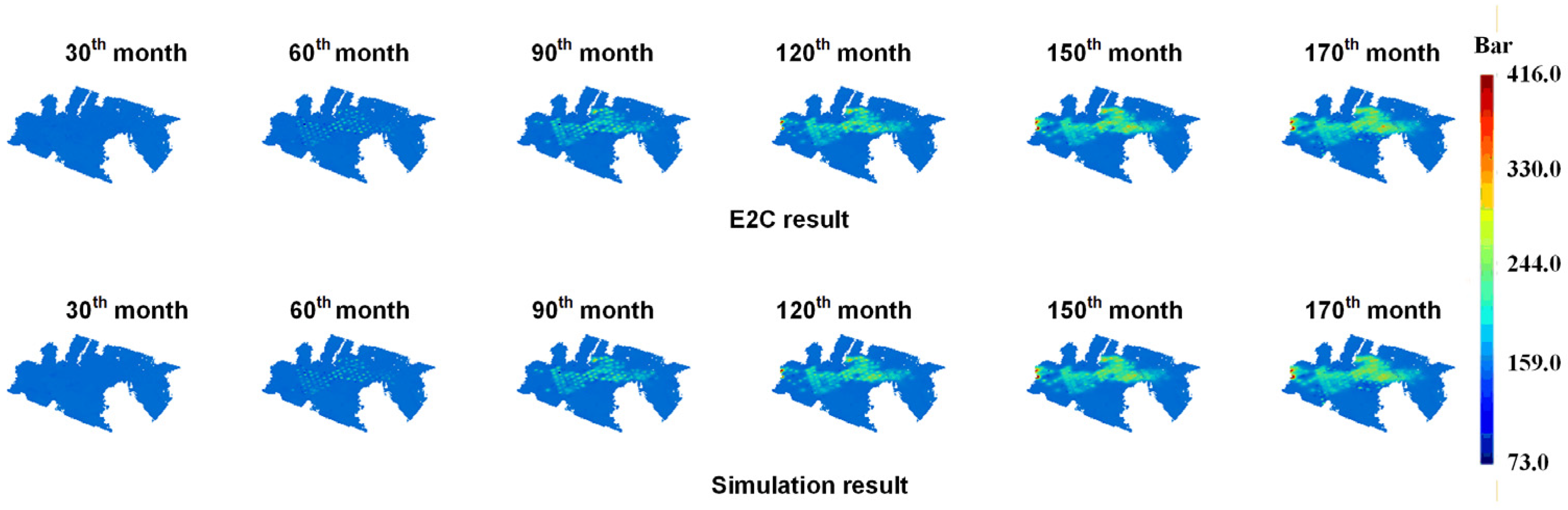 Figure 5 that the results of the E2C model are basically consistent with the results obtained using the numerical simulator in terms of the predicted pressure and saturation.