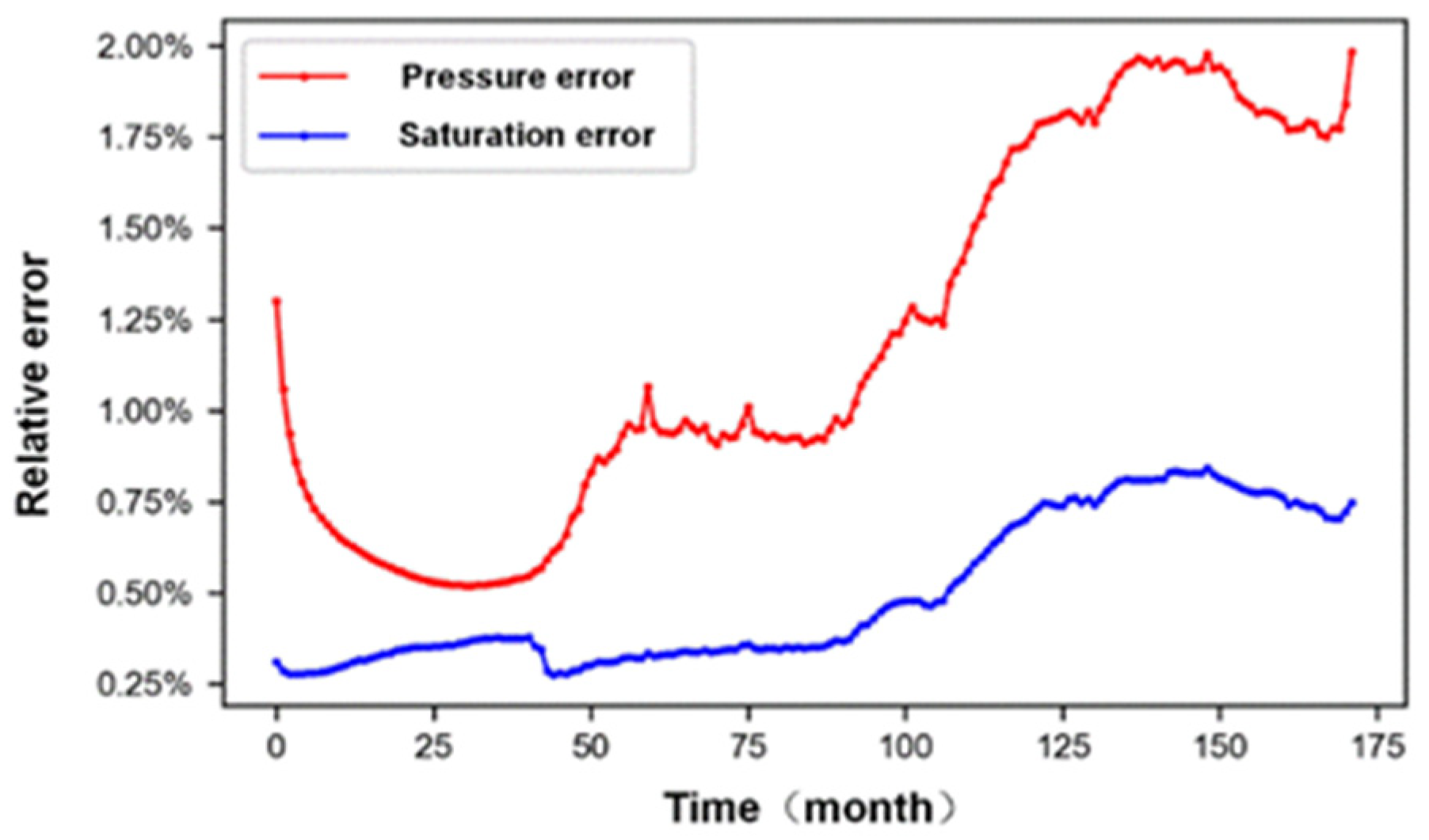 Figure 6 that the saturation and pressure predicted by the E2C model have maximum relative errors of less than 1% and less than 2%, respectively. Apparently, the E2C model has a higher accuracy in predicting pressure and saturation.