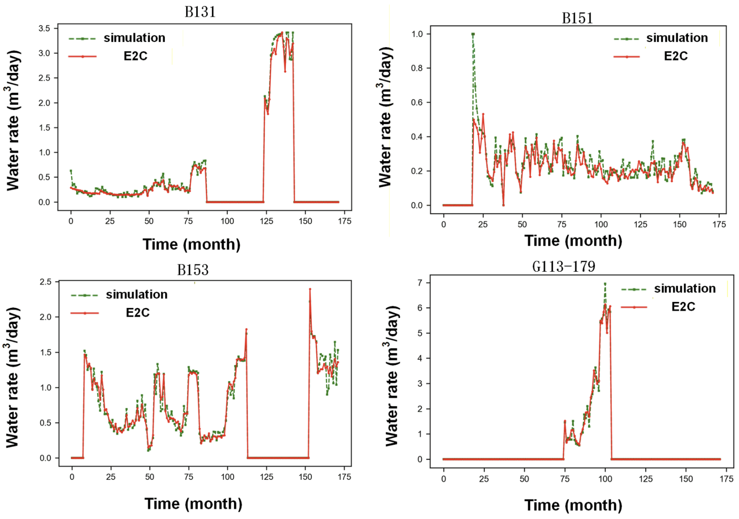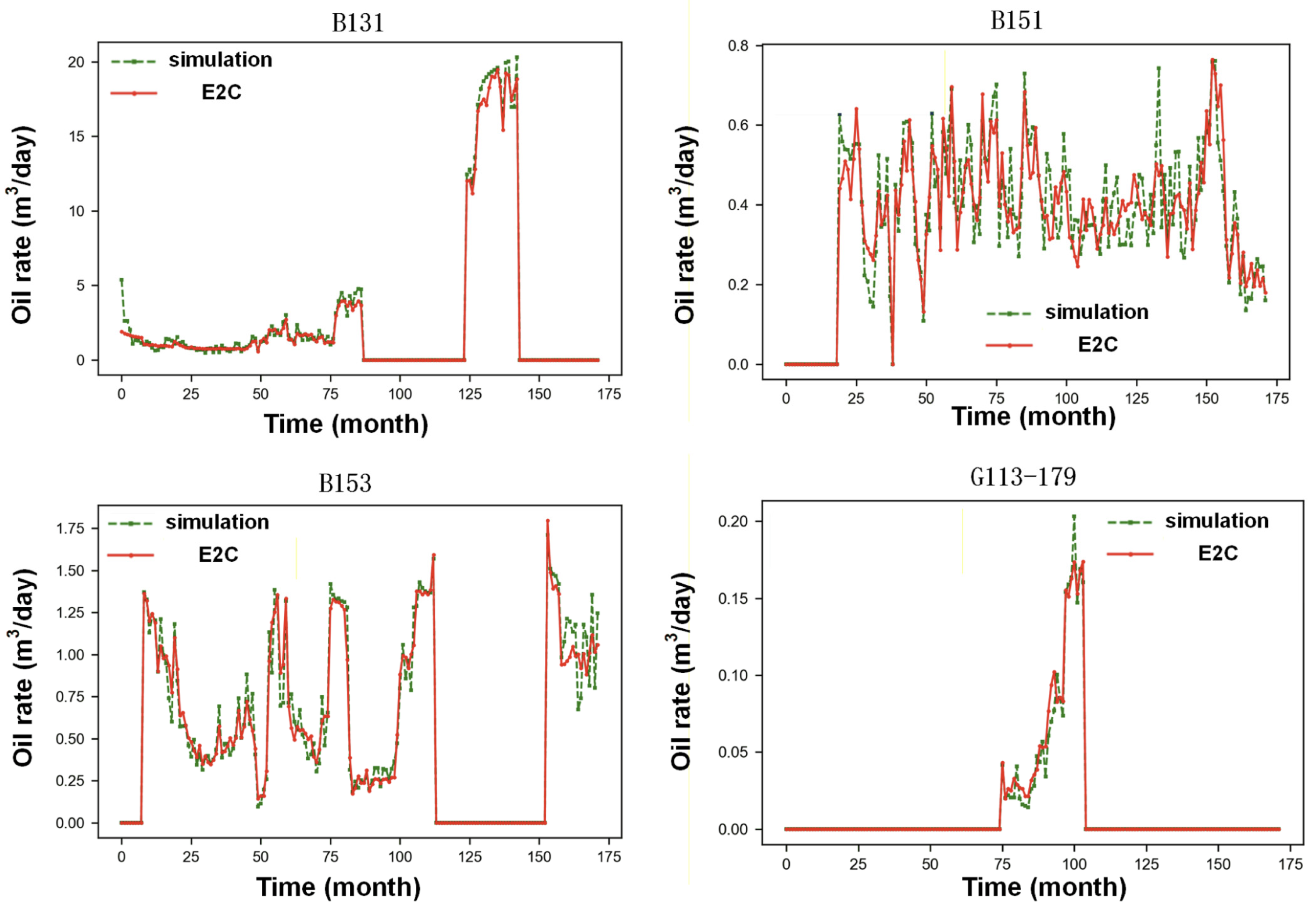 Figure 8. It can be seen from them that the production obtained using the E2C model is basically consistent with the simulation result of the numerical simulator. For well B151, although the daily oil and water productions predicted using E2C at some moments are smaller than the results of the numerical simulator (the peak value of the red line of B151 is lower than the blue line in the figure), with a very low production, this well has little impact on the total production of the reservoir.