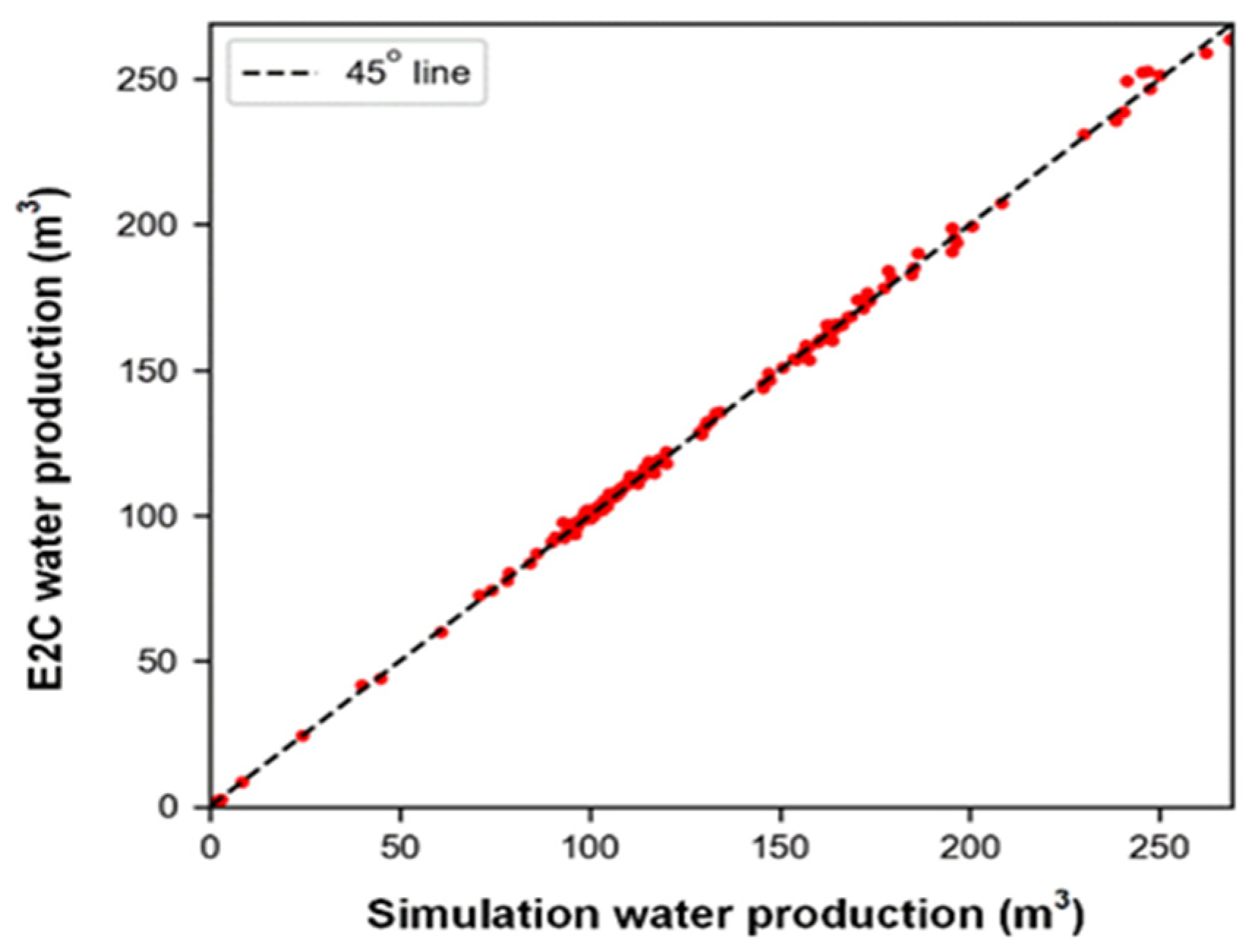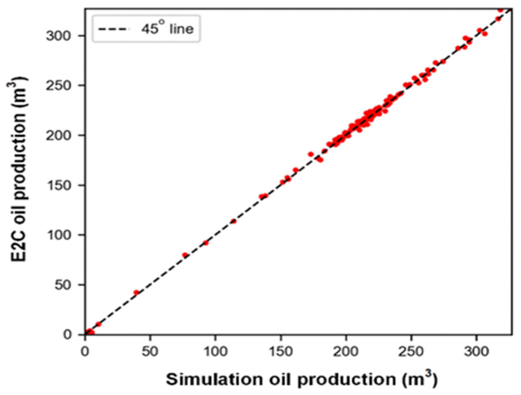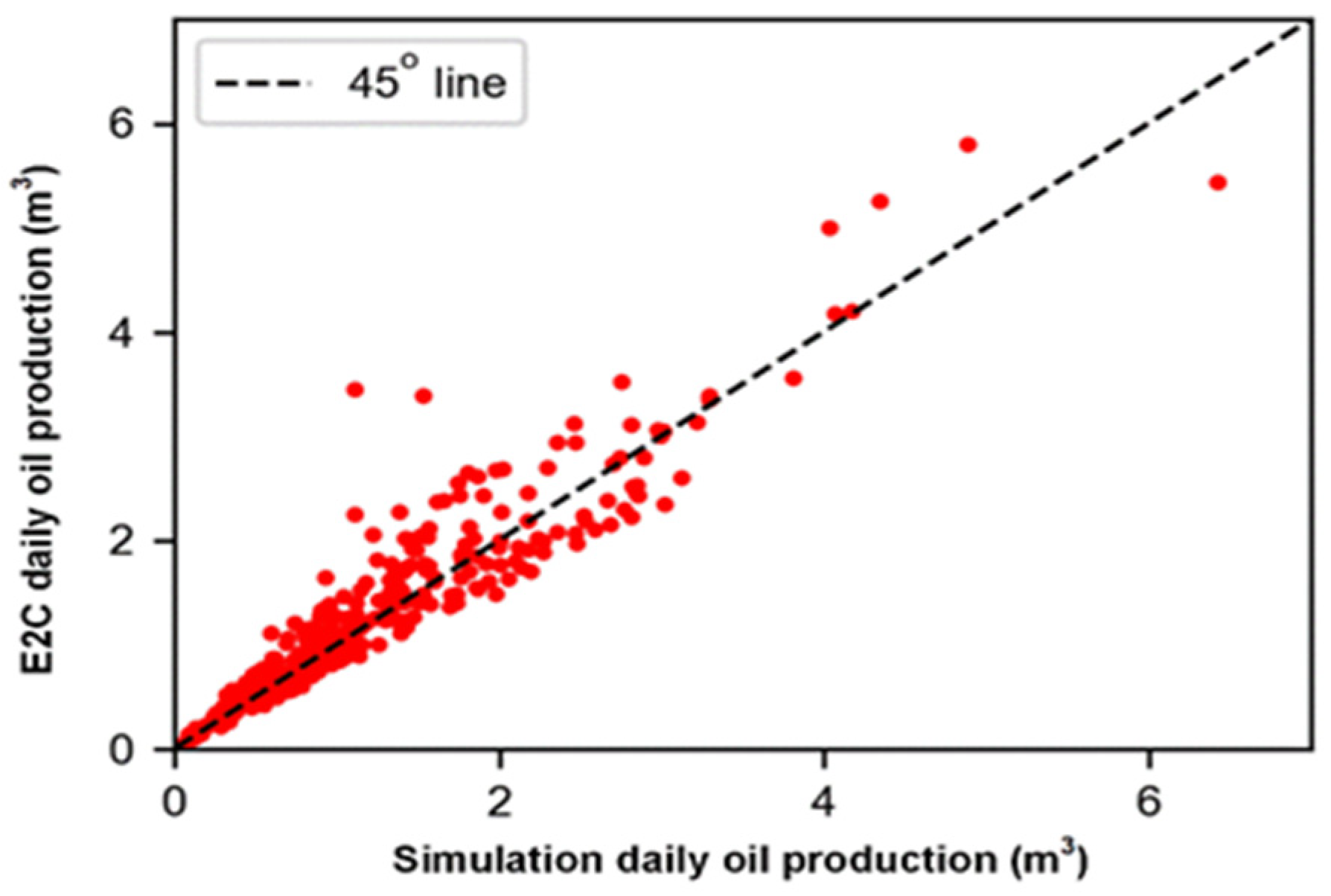 Figure 10. It can be seen from the two figures that all data points are distributed around the 45° line, which proves that the E2C model has a higher consistency and reliable accuracy in predicting the daily production of the reservoir compared with the numerical simulator.
