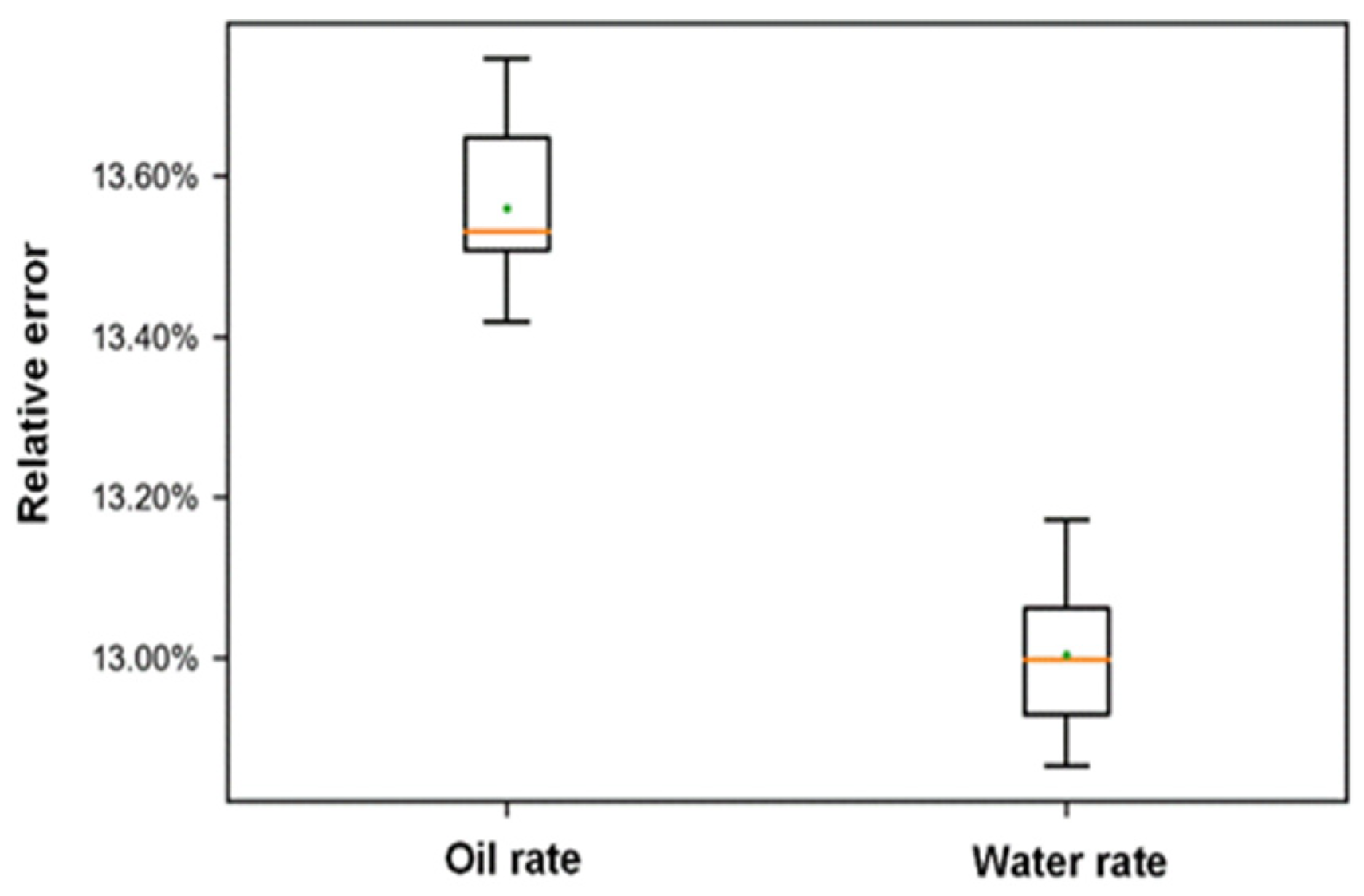 In order to avoid the contingency of random sampling, the relative errors of all test sets were counted and analyzed. As the daily production of some wells is 0 at some moments, in order to reduce the impact of the productions with a denominator of 0 on the error, the error calculation method used in this paper is as follows: