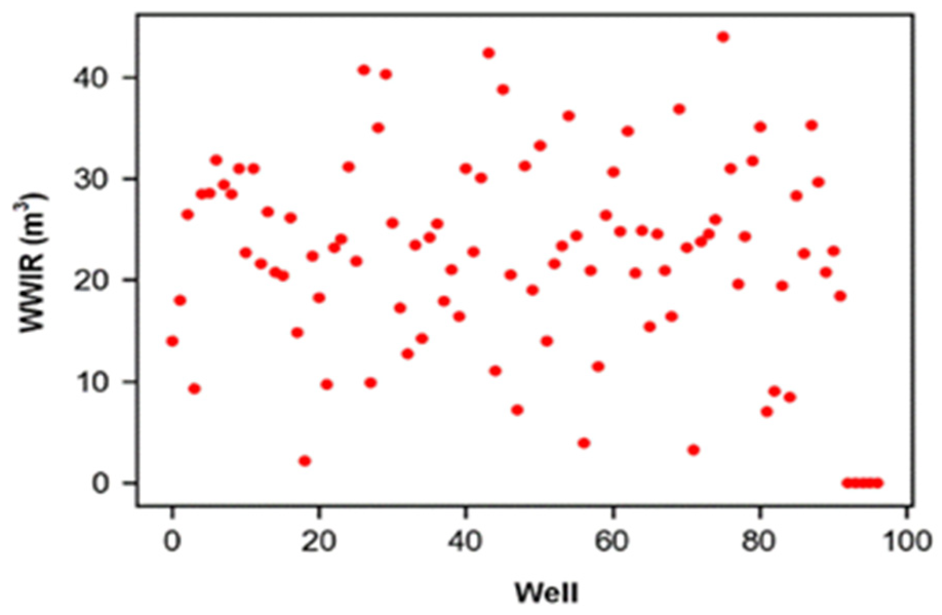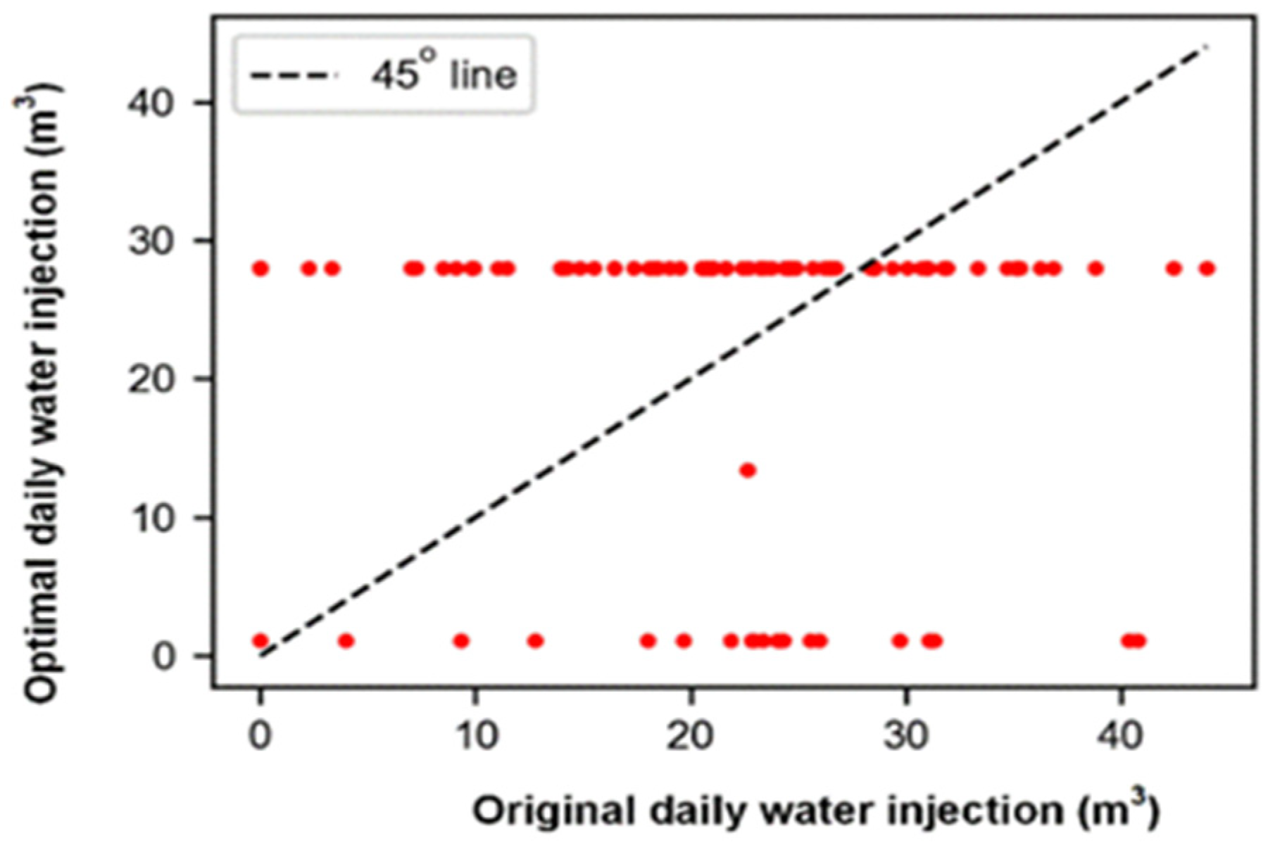 Figure 14 shows the difference between the optimal daily water injection volume and the initial daily water injection volume, where the black dotted line is the 45° line, representing that the results are completely consistent. It can be seen from the figure that the optimal daily water injection volume of each well deviates from the 45° line, and in some wells the water injection volume can reach the set maximum boundary. Therefore, there is a big difference between the optimal daily water injection volume and the initial daily water injection volume, which also sets higher requirements on the generalization ability of the surrogate model.