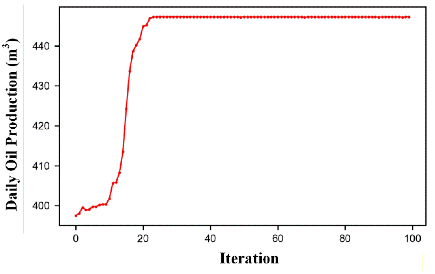 Figure 13. It can be seen from the figure that, in the first 30 iterations, the daily oil production of the reservoir increases rapidly and then tends to be stable.