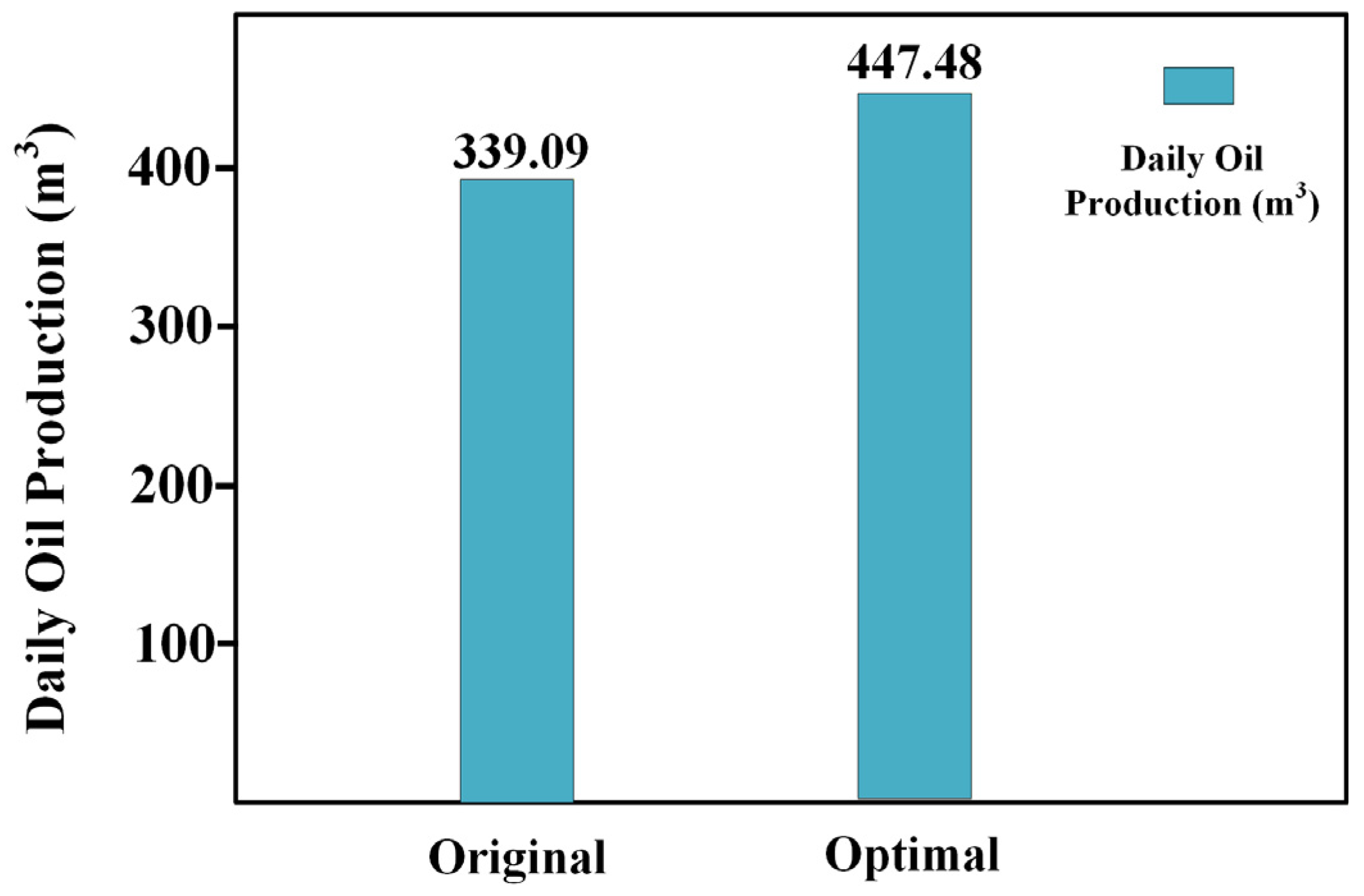 Figure 15 shows the change in daily oil production of the reservoir before and after the optimization. It can be seen from the figure that the daily oil production of the reservoir at the last time step is 393.09 m