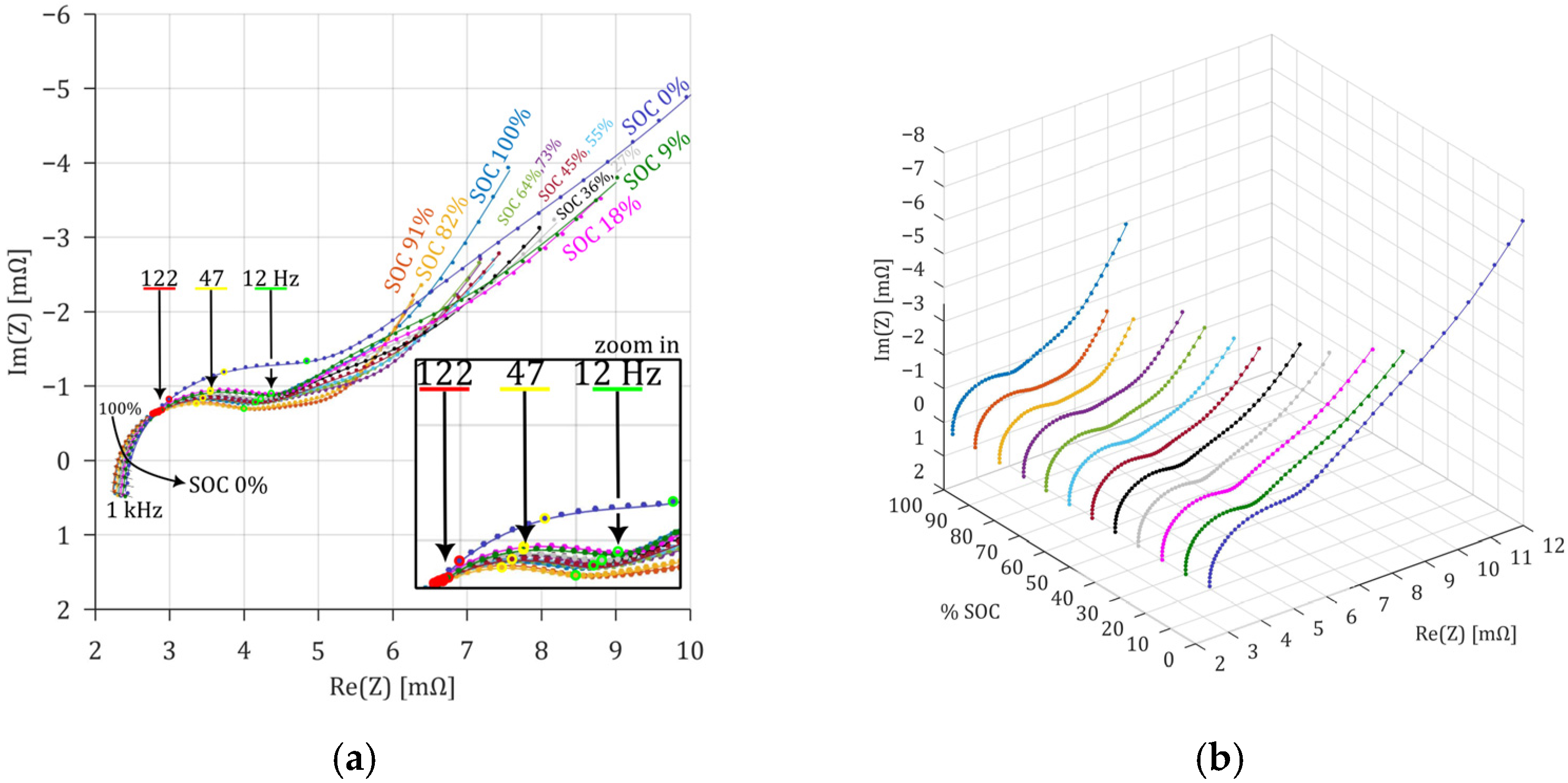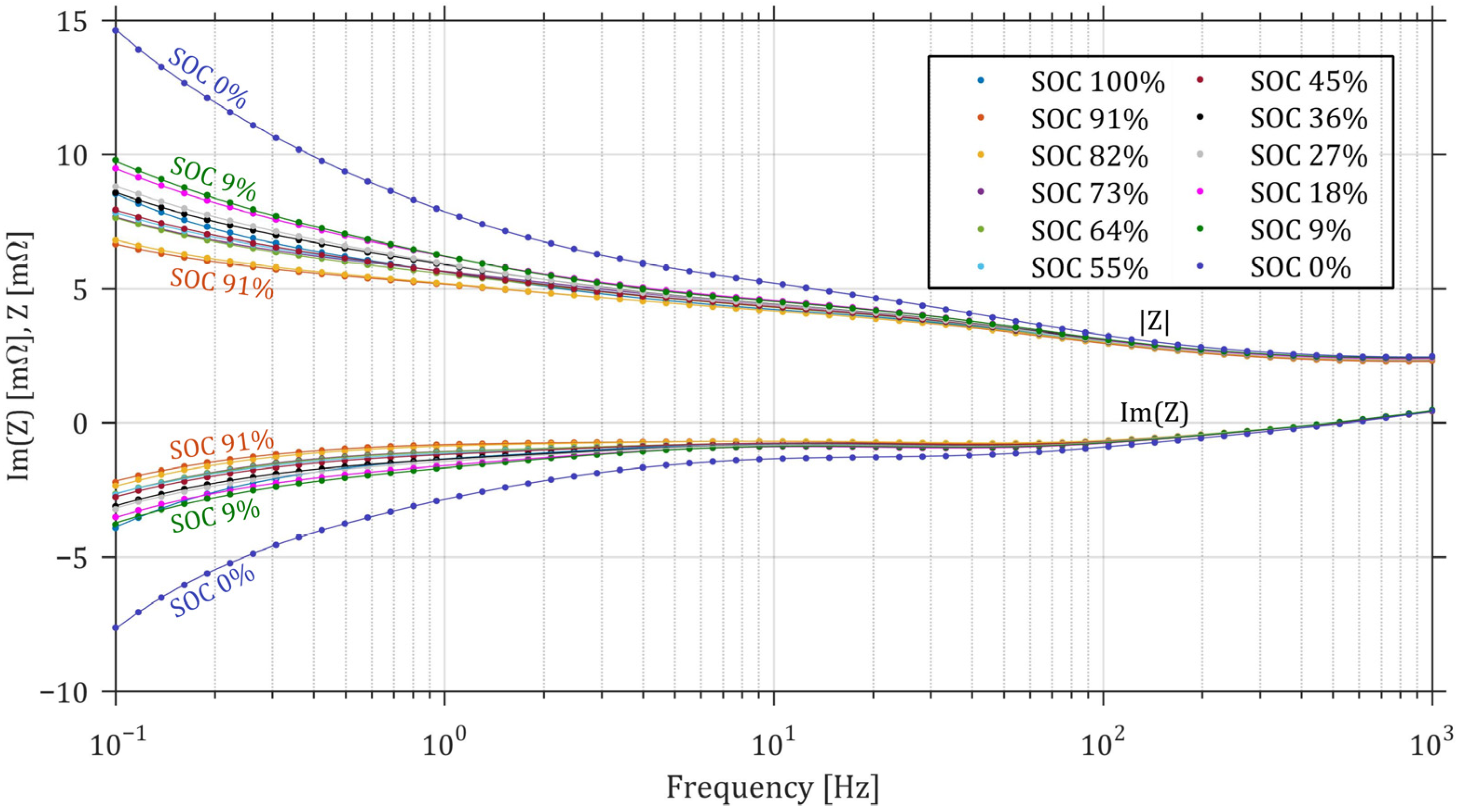- Mc Carthy, K.; Gullapalli, H.; Ryan, K.M.; Kennedy, T. Use of impedance spectroscopy for the estimation of Li-ion battery state of charge, state of health and internal temperature. J. Electrochem. Soc. 2021, 168, 080517. [Google Scholar] [CrossRef]