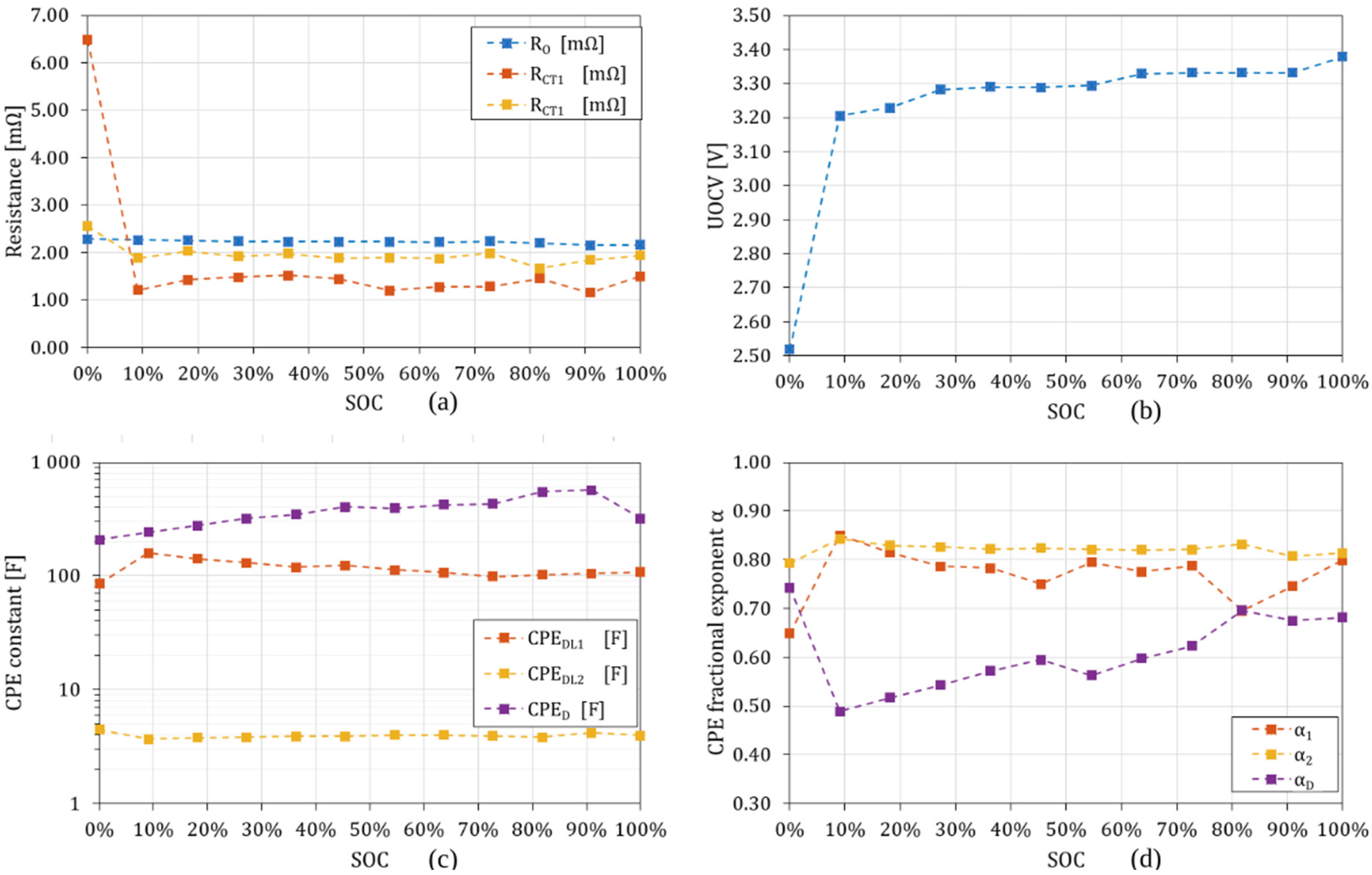 | %SOC | L [nH] | RO [mΩ] | CPEDL1 [F] | α1 | RCT1 [mΩ] | CPEDL2 [F] | α2 | RCT2 [mΩ] | CPED [F] | αD | WRSS 1 |