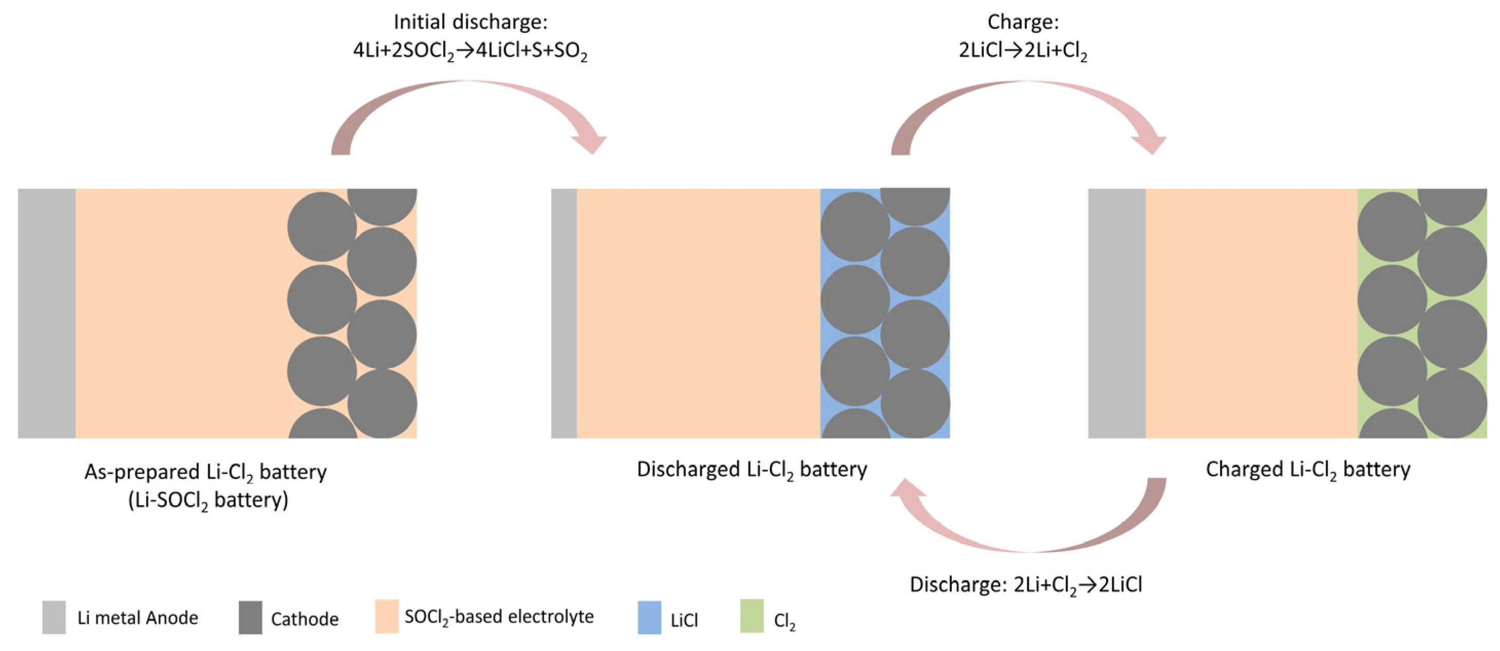 The basic chemical reaction of Li-Cl2 batteries, as an example, is presented as follows to briefly illustrate the working principles of metal–chlorine batteries. This working principle is also illustrated in Figure 1. The as-prepared Li-Cl2 battery, a Li-SOCl2 battery, initially discharges with an overall battery reaction of: