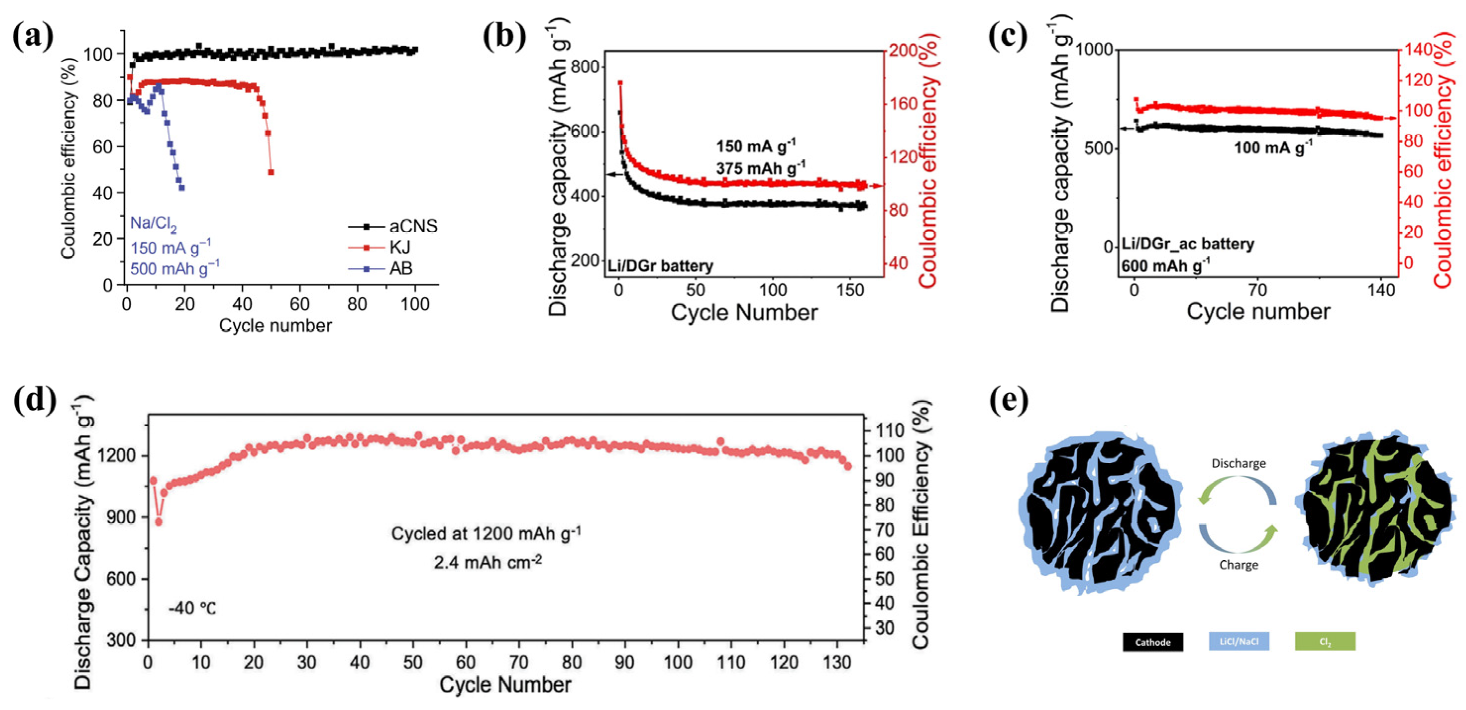 Figure 2. Critical roles of cathodes in metal–chlorine batteries. (a) Coulombic efficiencies of Na-Cl2 batteries using aCNS, KJ and AB as cathodes [9]. (b) Cycling performance of a Li-Cl2 battery using DGr as a cathode [11]. (c) Cycling performance of a Li-Cl2 battery using DGr_ac as a cathode [11]. (d) Cycling performance of a Li-Cl2 battery using KJCO2 as a cathode [14]. (e) Schematic illustration of the working principle of the cathode of metal–chlorine batteries.