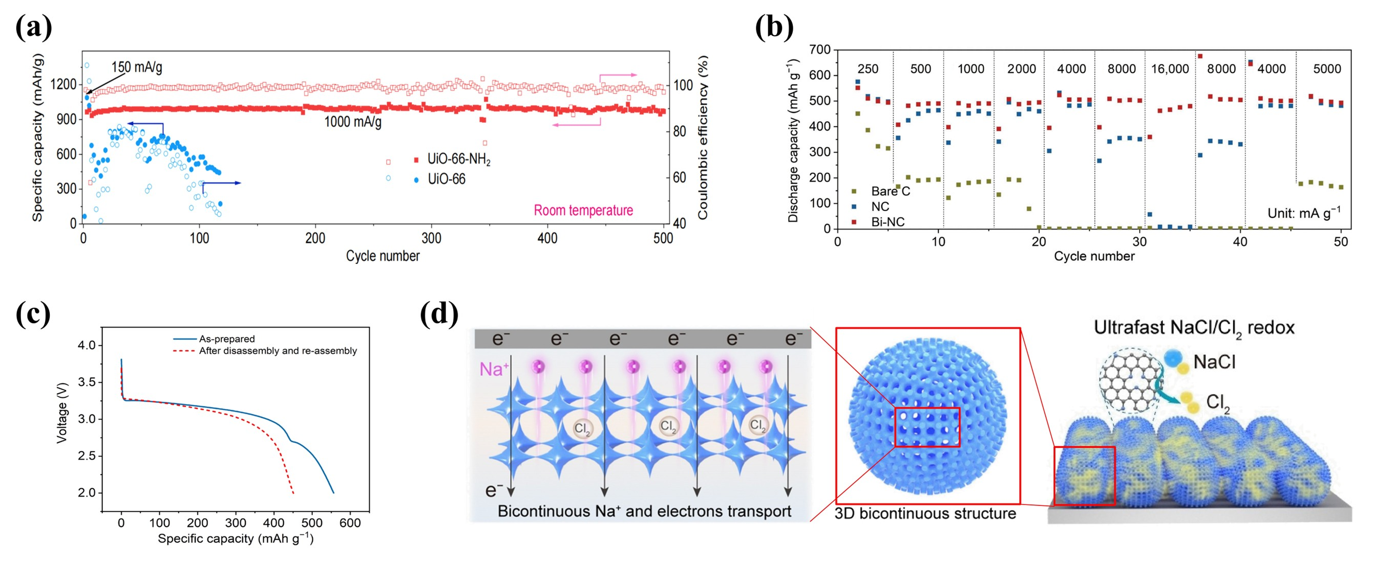 Figure 3. Cathode-induced dramatic performance enhancement of metal–chlorine batteries. (a) Cycling performance of Li-Cl2 batteries using UiO-66-NH2 and UiO-66 as cathode [12]. (b) Cycling performance of Na-Cl2 batteries under different rate capability using bare C, N-doped carbon (NC) and Bi-NC as a cathode [13]. (c) Discharge curves of as-prepared and re-assembled Na-Cl2 batteries [13]. (d) Microstructure and working mechanism of the Bi-NC cathode [13].