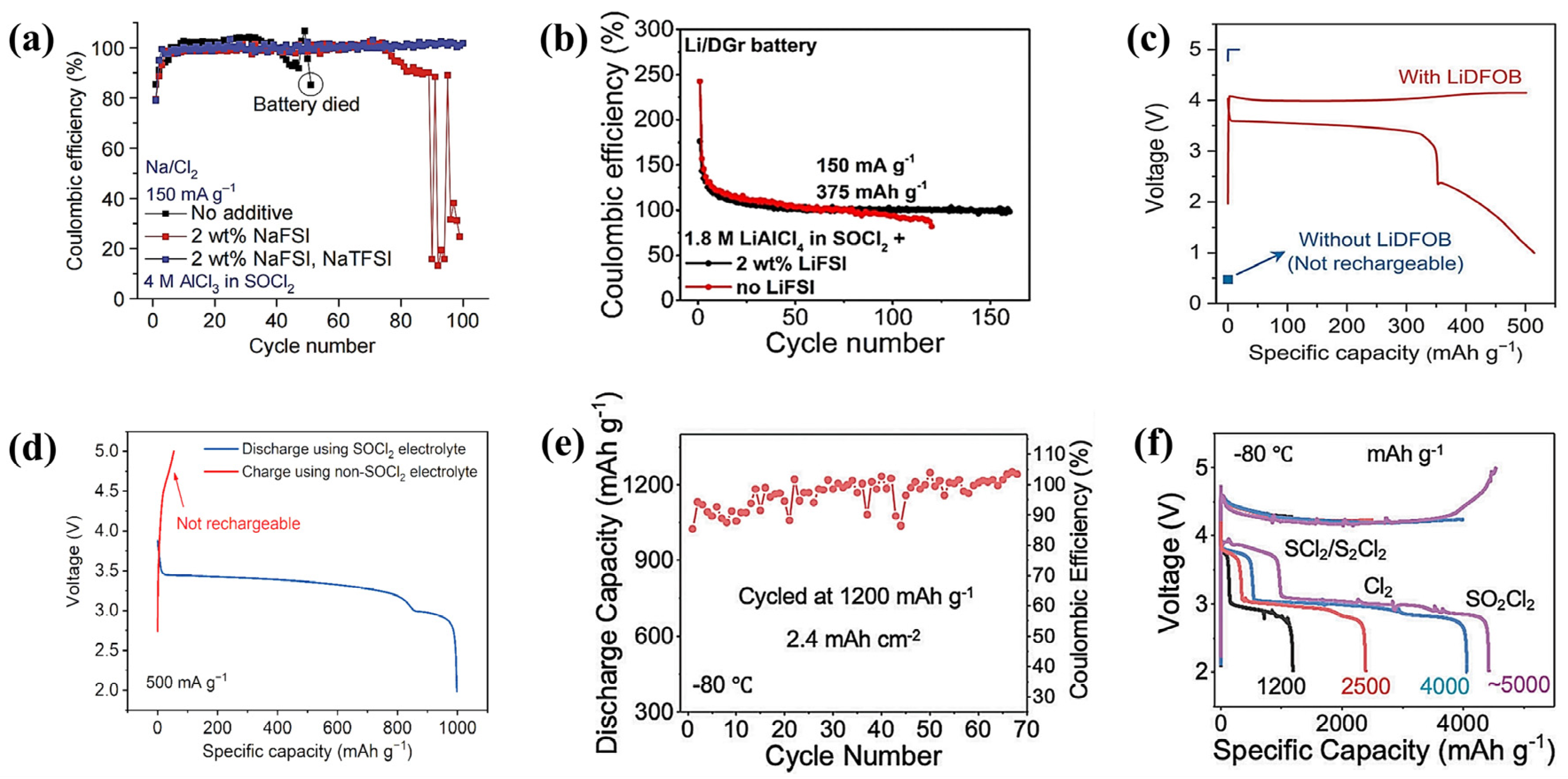 Figure 4. Critical roles of electrolyte on metal–chlorine batteries. (a) Coulombic efficiencies of Na-Cl2 batteries using the electrolyte of 4 mol L−1 AlCl3 in SOCl2 with different additives [9]. (b) Cycling performance of Li-Cl2 batteries using 1.8 mol L−1 AlCl3 in SOCl2 with and without 2 wt.% LiFSI as the electrolyte [11]. (c) Charge–discharge curves of Ca-Cl2 batteries using 6 mol L−1 AlCl3 and 1.2 mol L−1 CaCl2 in SOCl2 with and without 1.3 mol L−1 LiDFOB as the electrolyte [15]. (d) Discharge and charge curves of Na-Cl2 batteries using SOCl2 and non-SOCl2 electrolyte, respectively [13]. (e) Cycling performance of a Li-Cl2 battery at −80 °C [14]. (f) Charge–discharge curves of Li-Cl2 batteries with 1200 to 5000 mAh g−1 cycling capacities [14].