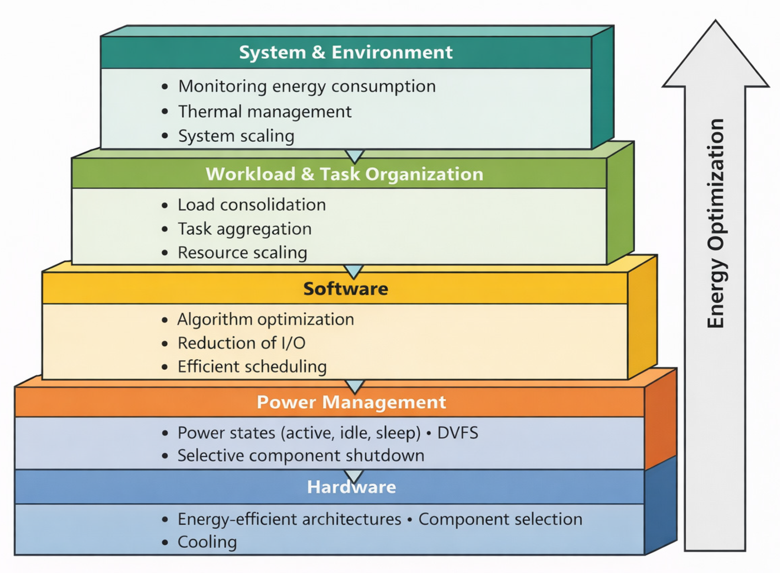 | Application/runtime | Energy-aware software | Efficient algorithms, batching, reducing polling, adaptive sampling | Reduces CPU cycles and I/O activity | May reduce accuracy/quality; developer effort |