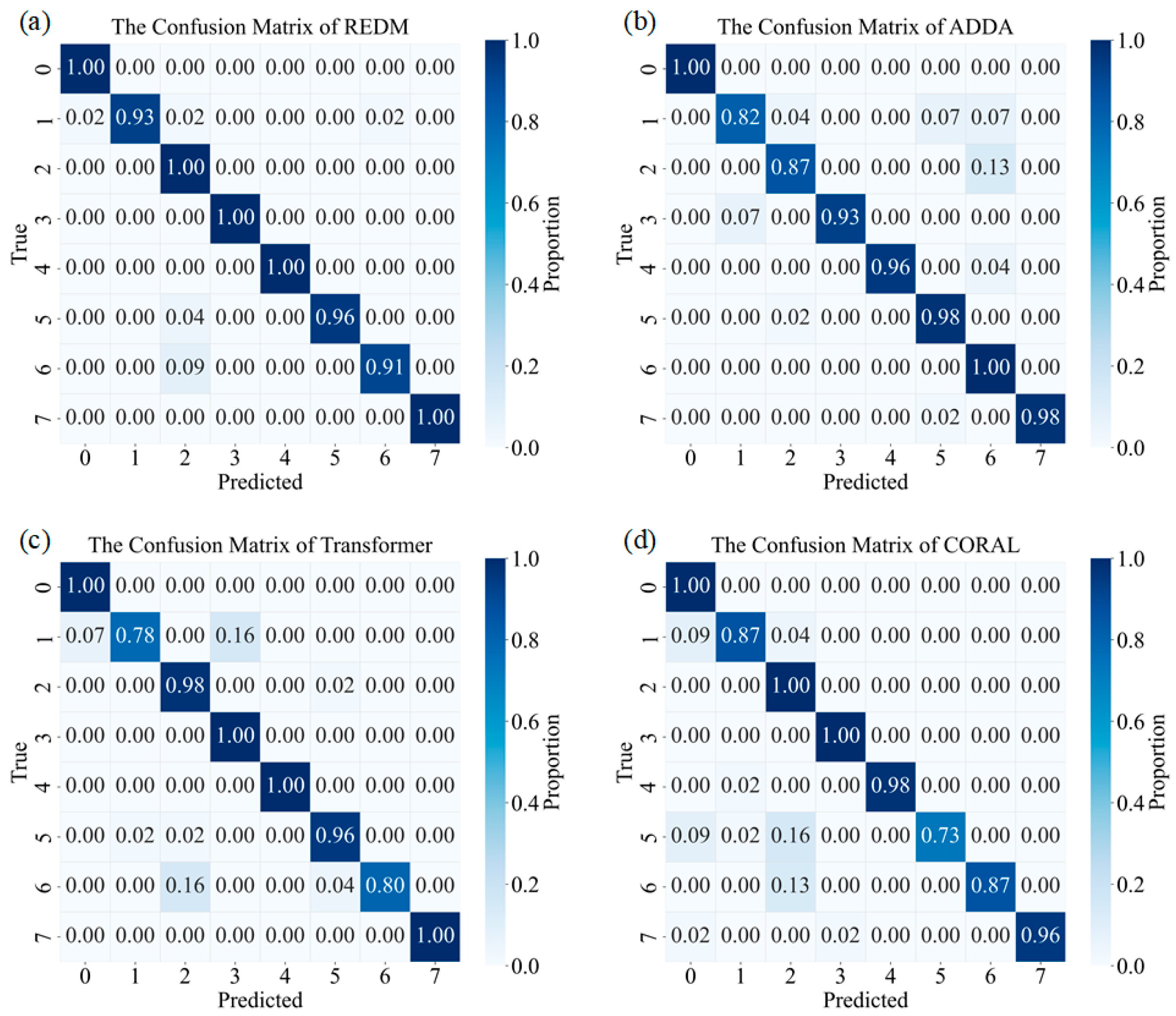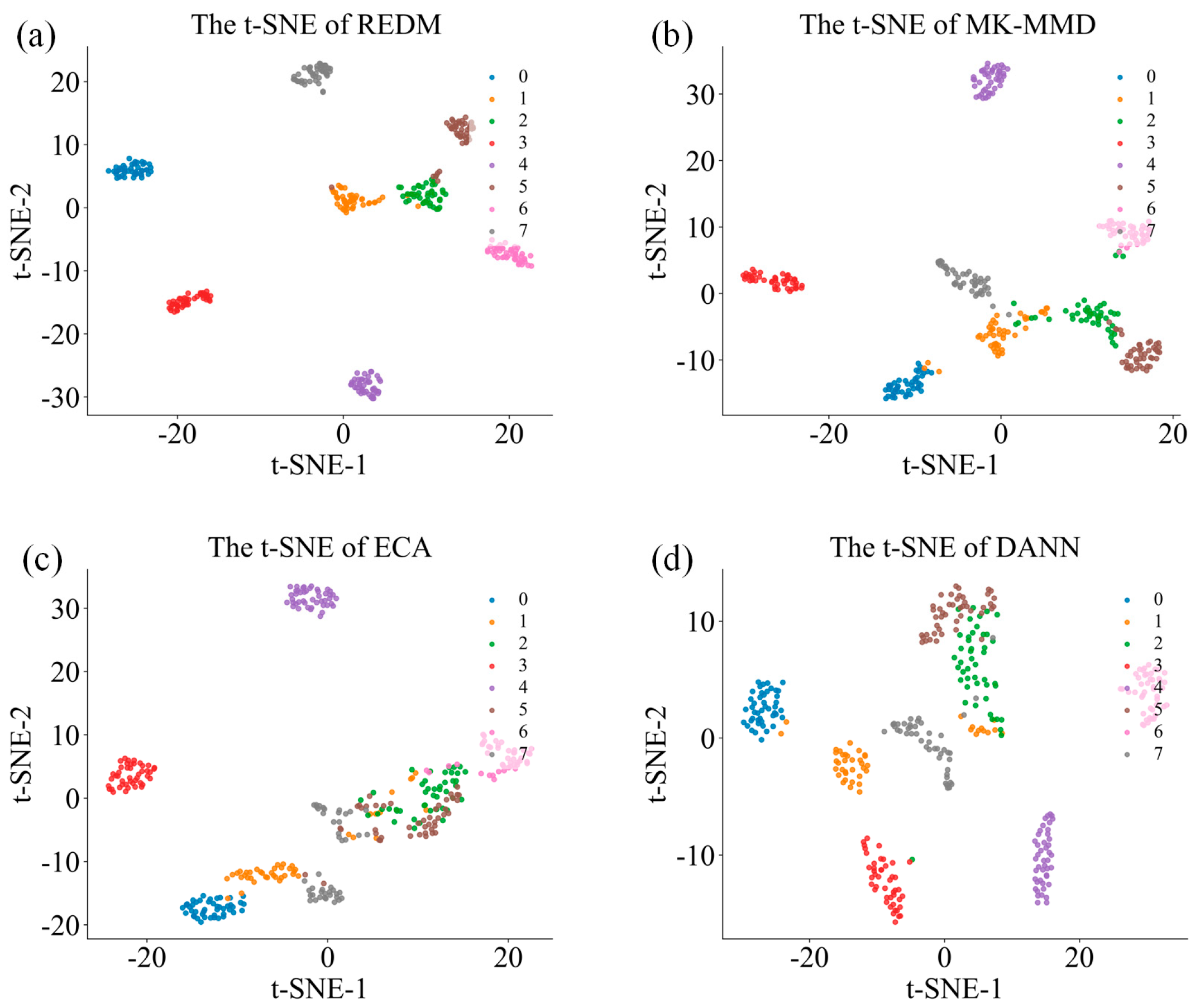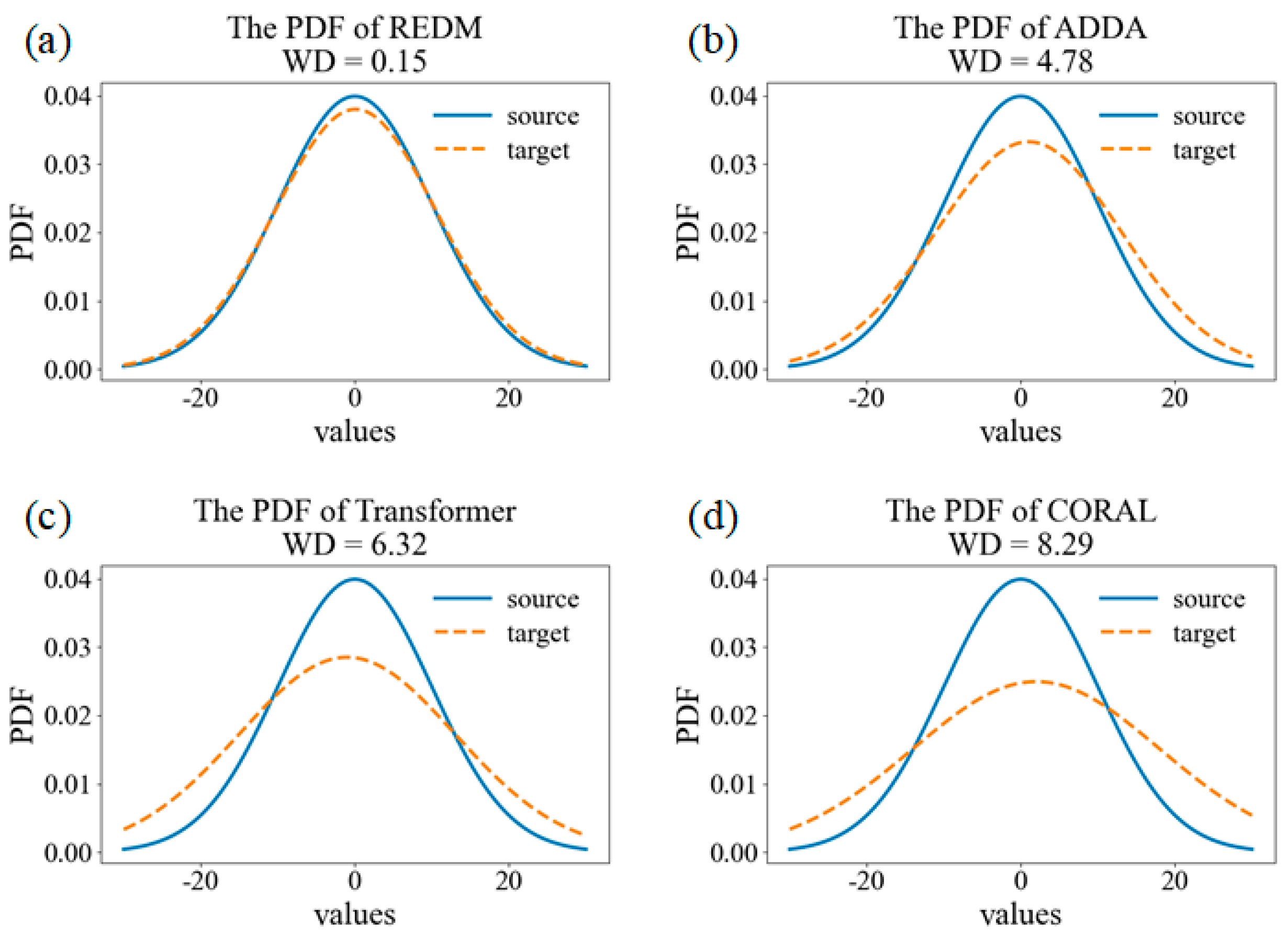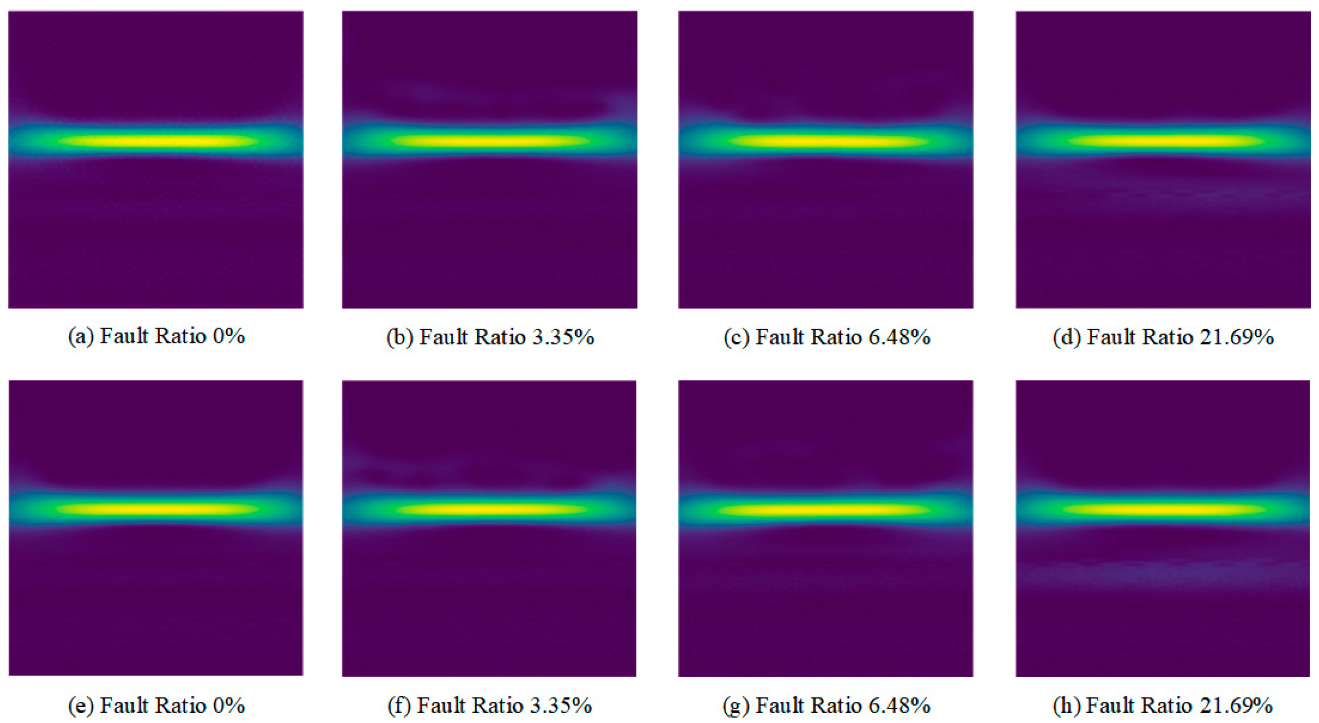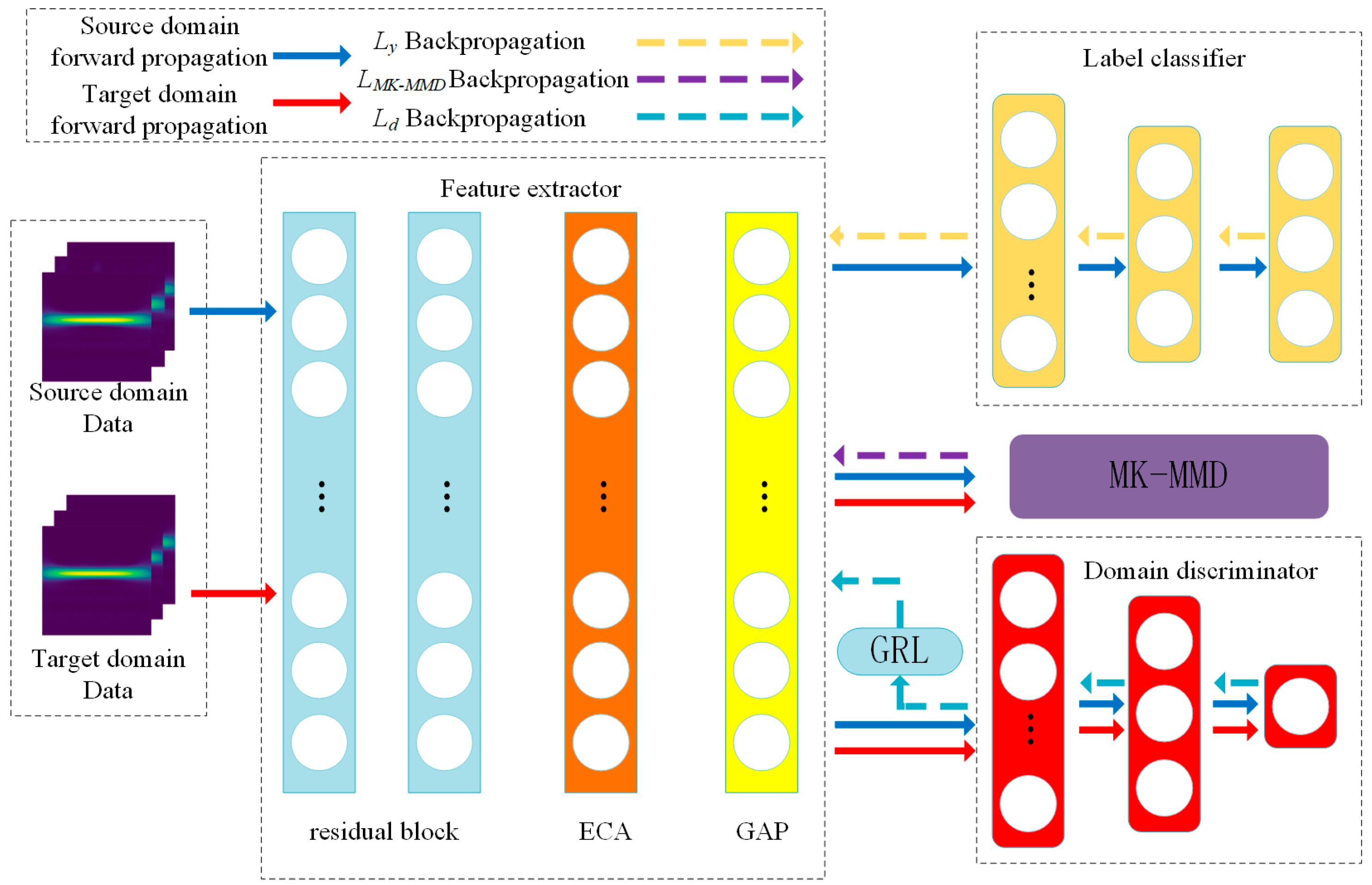 - Continuous wavelet transform was first employed to convert one-dimensional three-phase current signals into two-dimensional time–frequency maps, thereby retaining fault-related characteristics in both the time and frequency domains. These maps were then fed into the ResNet–ECA network, where deep discriminative source-domain features were extracted through residual learning and efficient channel attention. Furthermore, a domain-adversarial neural network together with an MK-MMD loss term was introduced to jointly align the marginal and conditional distributions between the source and target domains, markedly improving the model’s generalization capability and domain adaptability, and thereby enhancing diagnostic accuracy.