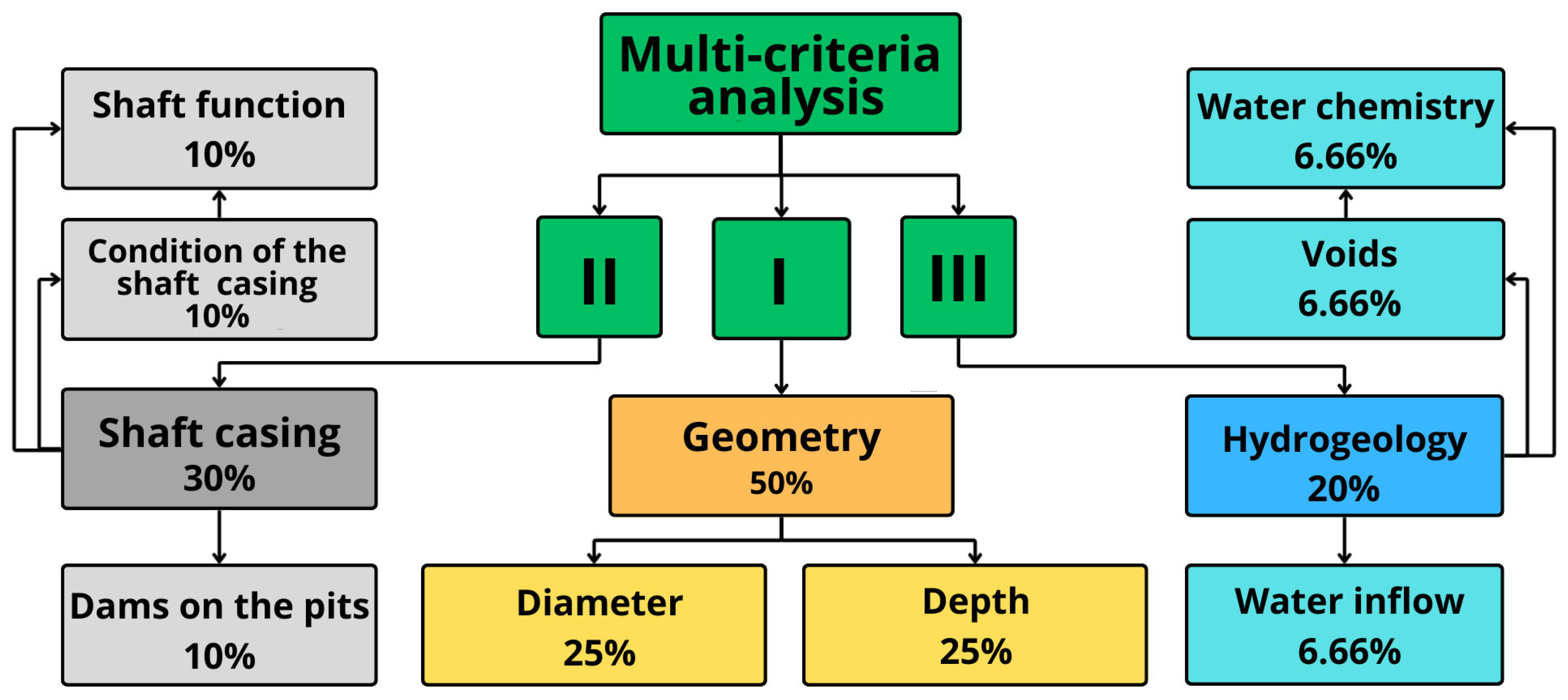26]. MCDA is a rigorous and structured research approach used to solve complex engineering problems by evaluating alternatives against multiple, often mutually exclusive technical, economic, and environmental criteria. In the context of post-mining transformation, MCDA enables the ranking of available shafts from the most to the least promising, considering not only geometric parameters but also hydrogeological factors and the technical condition of the lining.