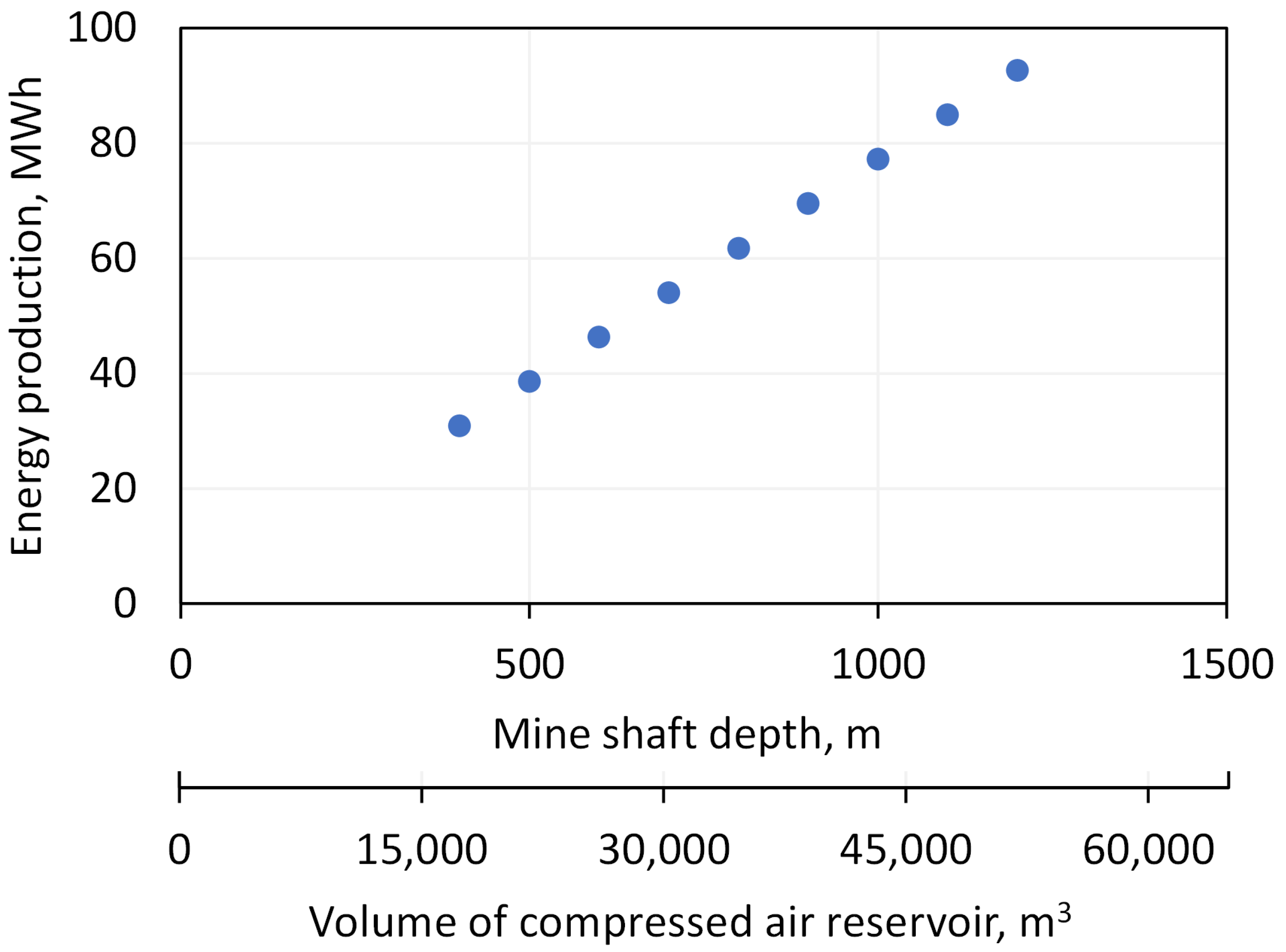 32]. The volume of the compressed air reservoir directly affects the mass flow rate of the compressed and expanded gas under the adopted operating schedule, which ultimately results in the achieved balance between consumed and generated energy in a given cycle and the revenue from system operation. The adopted minimum mine-shaft length ensures a sufficient compressed-air reservoir volume and enables the implementation of an economically justified investment over the planned operational lifetime.
