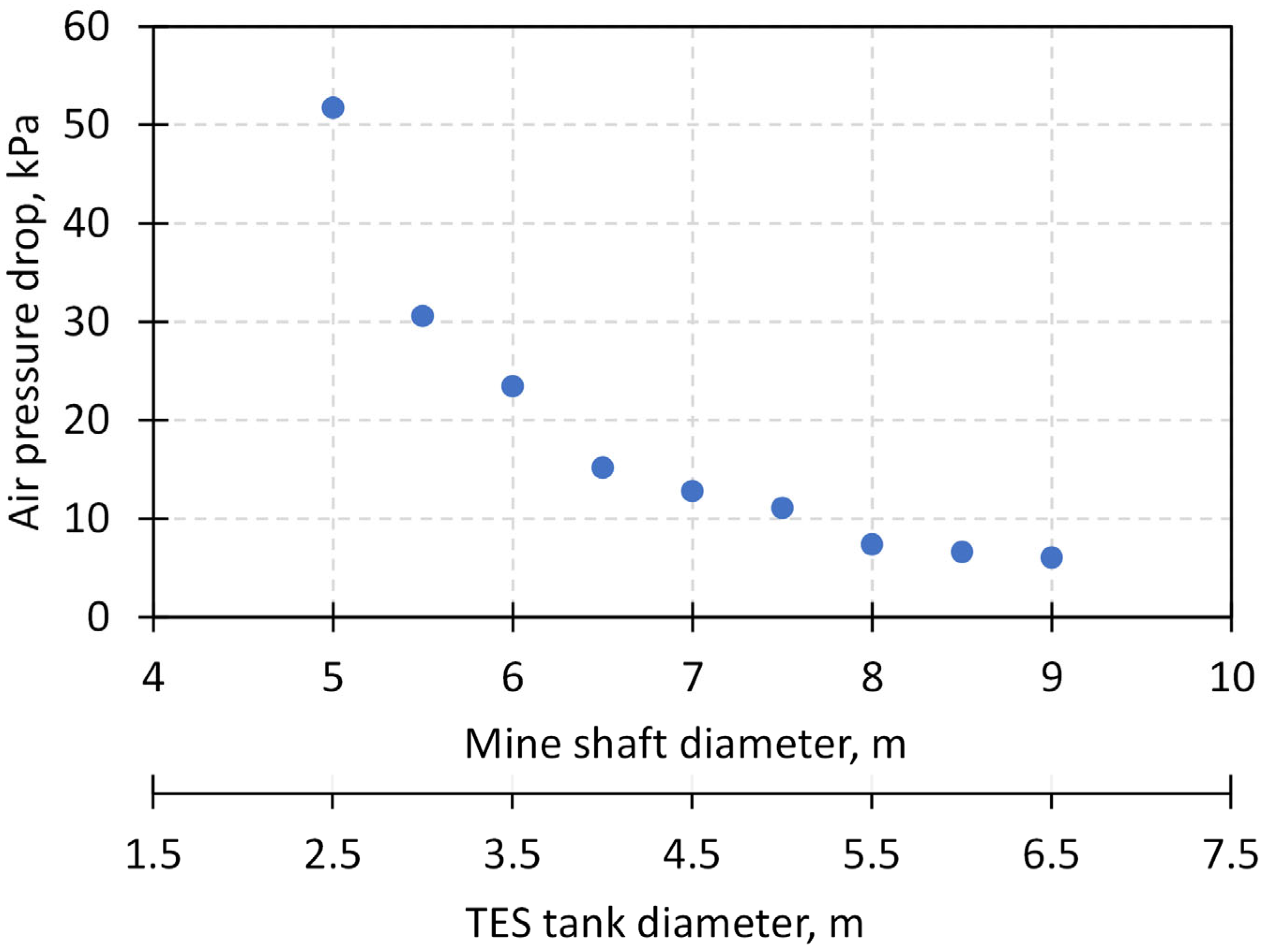 Figure 4, two stepwise changes in the maximum air pressure drop can be observed—for TES units with diameters
