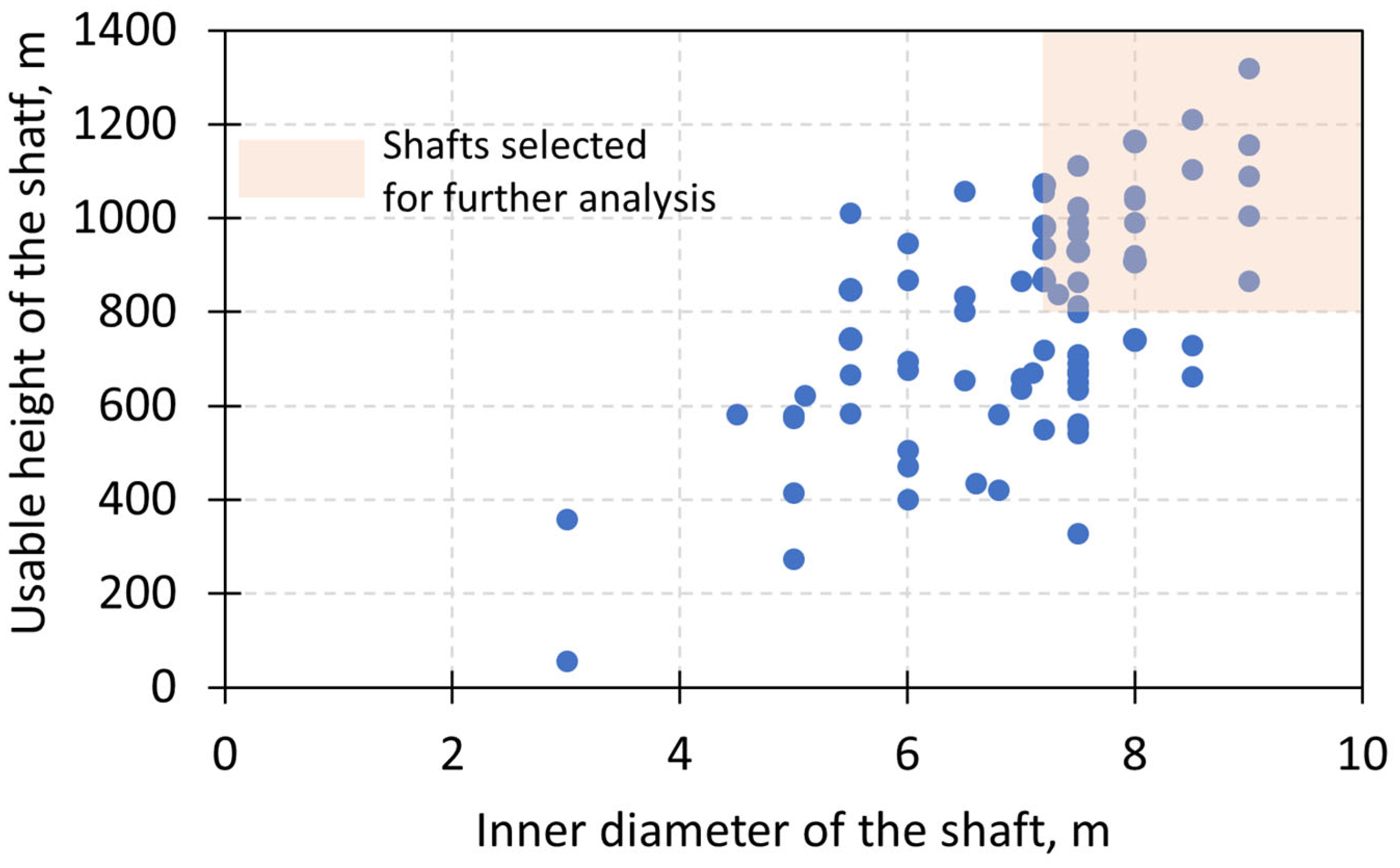 A national inventory of 228 active or non-decommissioned shafts was screened to identify candidates for a shaft-based A-CAES concept with integrated thermal-energy storage. Applying the geometric pre-selection criteria (shaft depth > 800 m and diameter > 7.5 m) reduced the dataset to 52 shafts that satisfy the minimum dimensional requirements for the assumed system configuration. This down-selection transforms a broad, heterogeneous inventory into a shortlist suitable for staged verification and early project development.