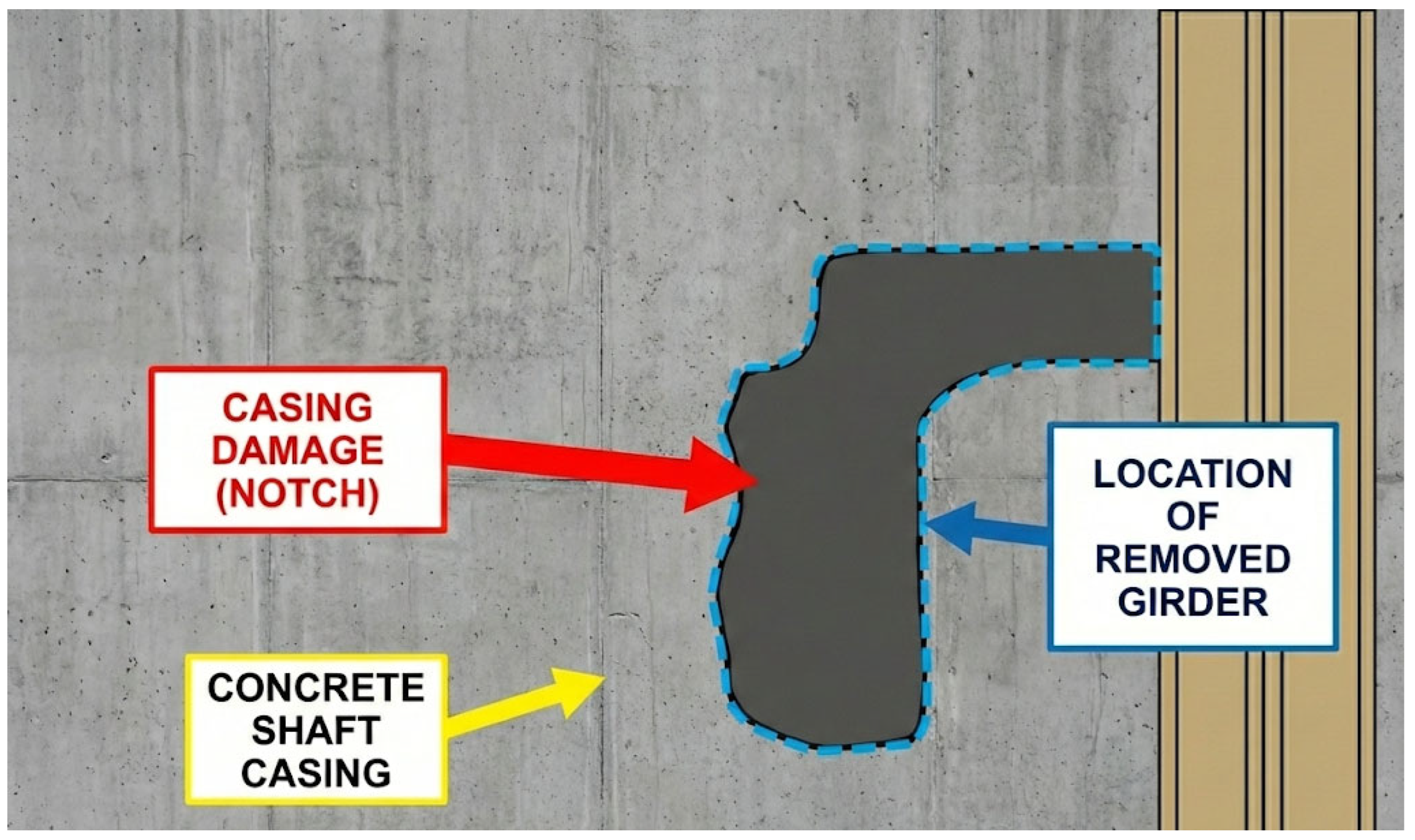 Figure 7 shows the loss of casing material after the disassembly of girders. This process must be completed, followed by the reconditioning of affected parts of the casing before it is strengthened and sealed as part of the adaptation for energy storage, if necessary. The process of removing girders and guides from the shaft is a natural step in shaft decommissioning. This process is well known and successfully performed in decommissioning works. Renovation of the shaft casing, consisting of filling the gaps left by the aforementioned elements, is also a commonly used practice in shaft works.