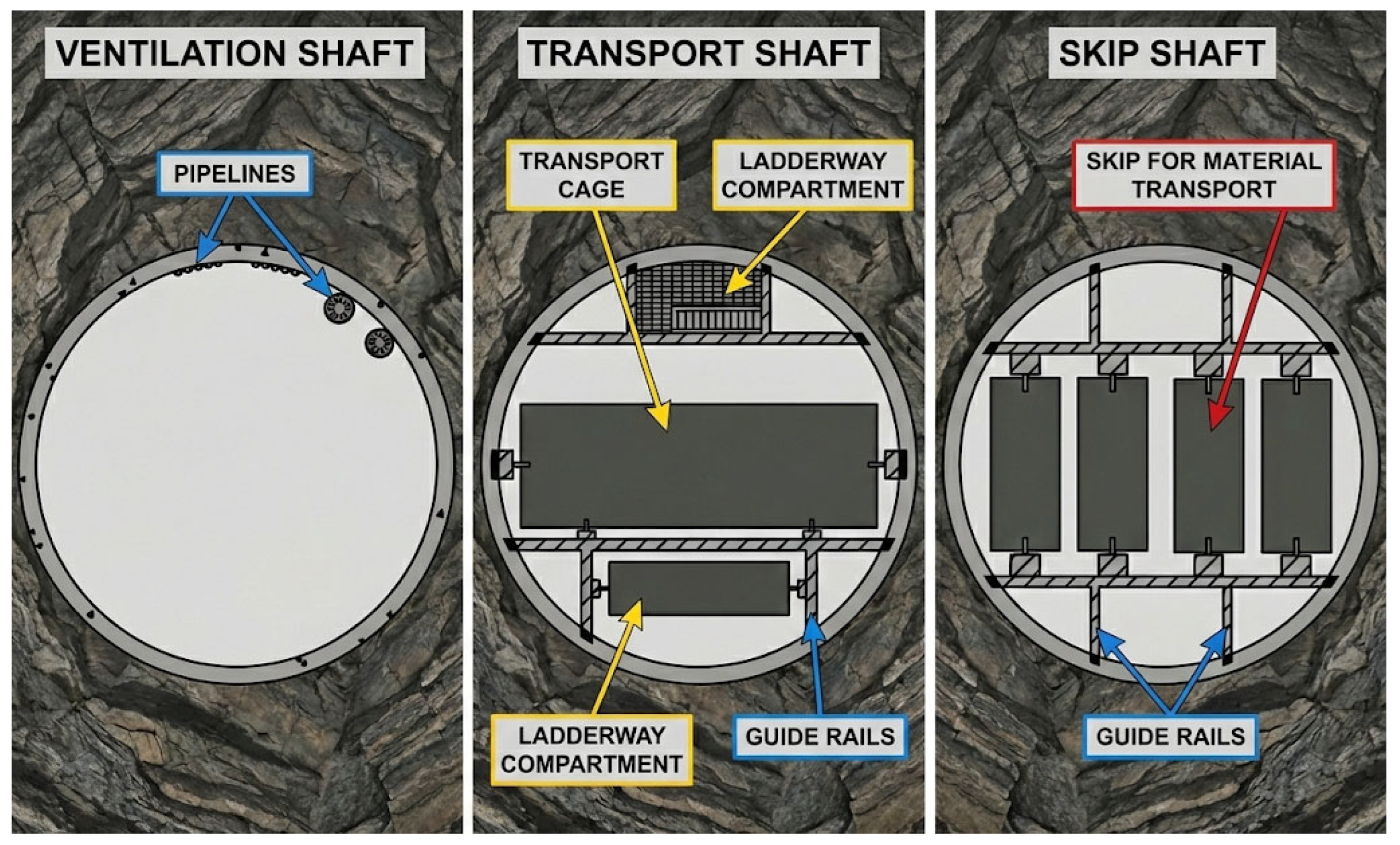 Shafts serve as the main excavation accessing mineral deposits in underground mines. Typically, at least two shafts are constructed: one deeper shaft located in the main mining area, used for transport and inlet ventilation, and another, peripheral serving as an outlet ventilation shaft. Due to their distinct purposes, they differ significantly in terms of equipment.