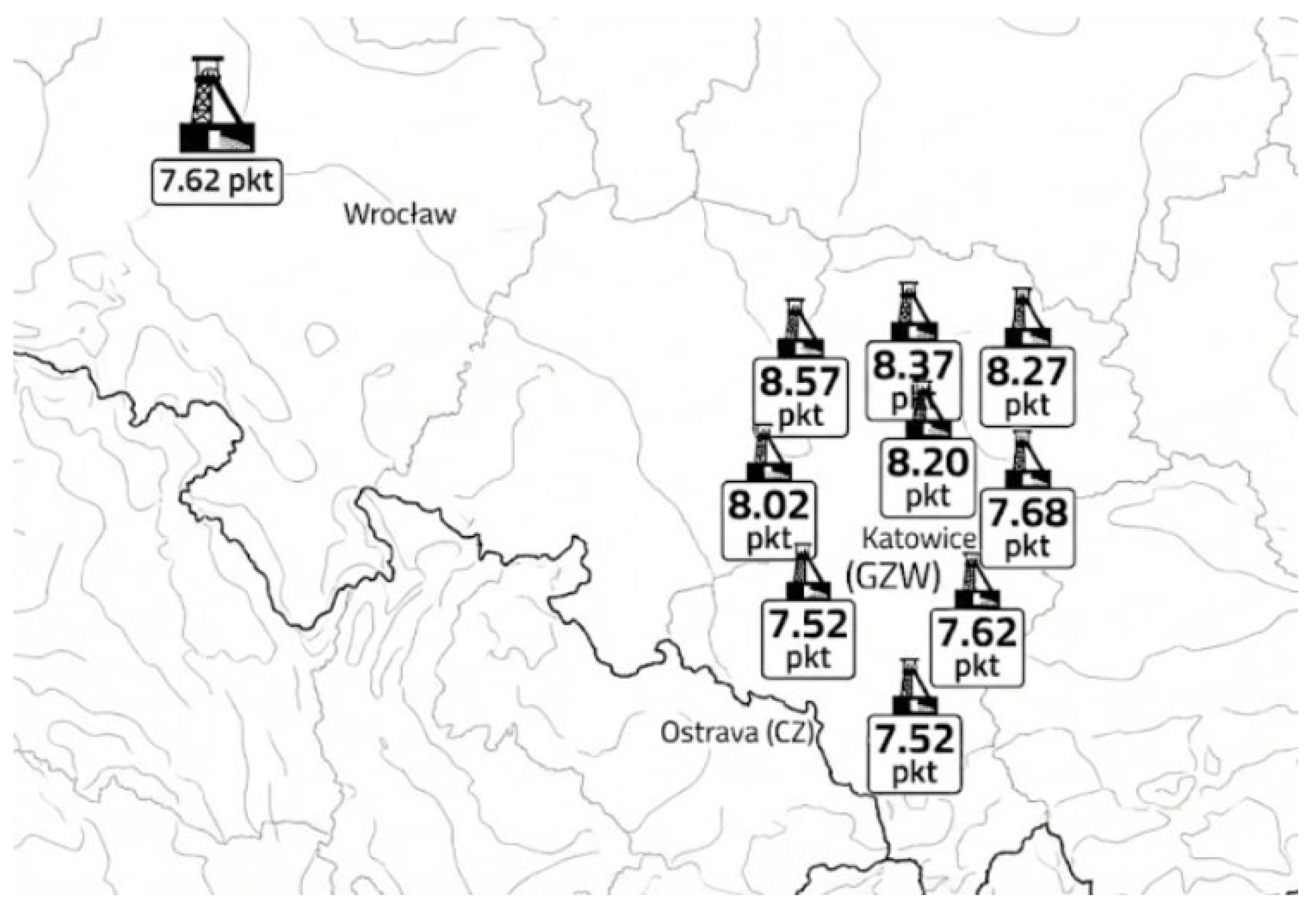 The method has limitations typical of national-scale screening. Several criteria are necessarily represented by proxies and discretized scores (e.g., repair/sealing scope inferred from material volumes and shaft type). The discrete scoring system was deliberately selected to avoid the ‘false precision’ fallacy inherent in heterogeneous archival datasets, prioritizing robust categorization into quality tiers over sensitive linear ranking. The presented ranking should therefore be interpreted as a prioritization tool rather than a definitive feasibility statement; sensitivity checks on weights and thresholds are recommended to ensure that the highest-ranked shafts remain robust under plausible changes in decision priorities. Similarly, the aggregated storage potential (~4.1 GWh) is a technical estimate derived from shaft volumes and assumed system parameters; site-specific pressure envelopes, leakage pathways, and operational optimization will refine this value at the feasibility stage. Location of shafts with highest scoring in the region under assessment is shown in
