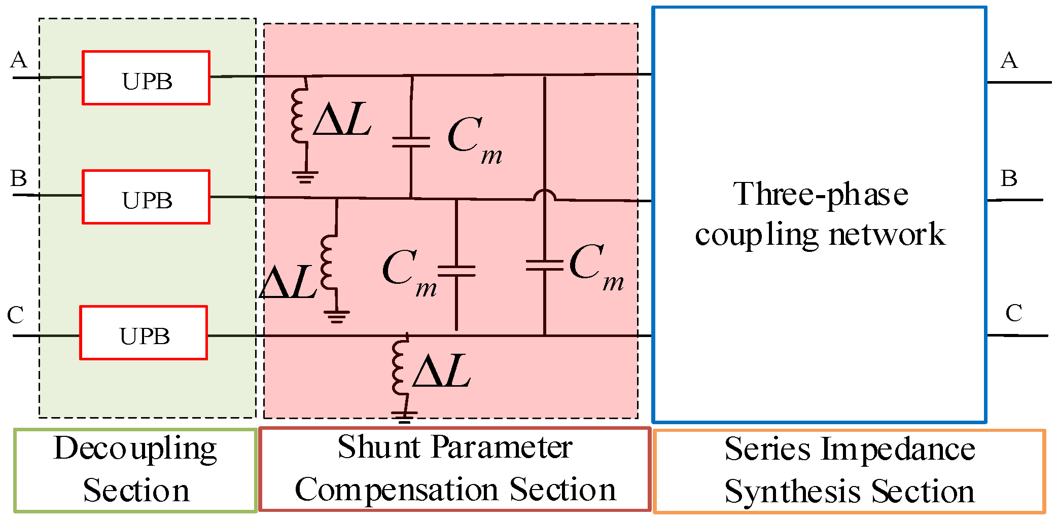 - Shunt compensation section: A lumped network that cancels the artificial shunt susceptance introduced by enforcing and inserts the physical phase-to-phase capacitance consistent with .