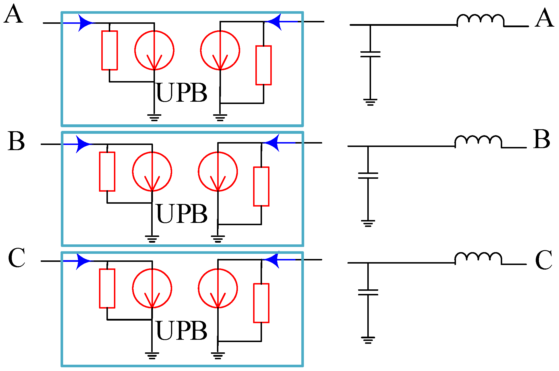- Decoupling section (one-step UPB cell): An uncoupled per-phase Bergeron (UPB) structure whose parameters are modified so that its travel time equals exactly one simulation step, . This provides interpolation-free terminal decoupling.