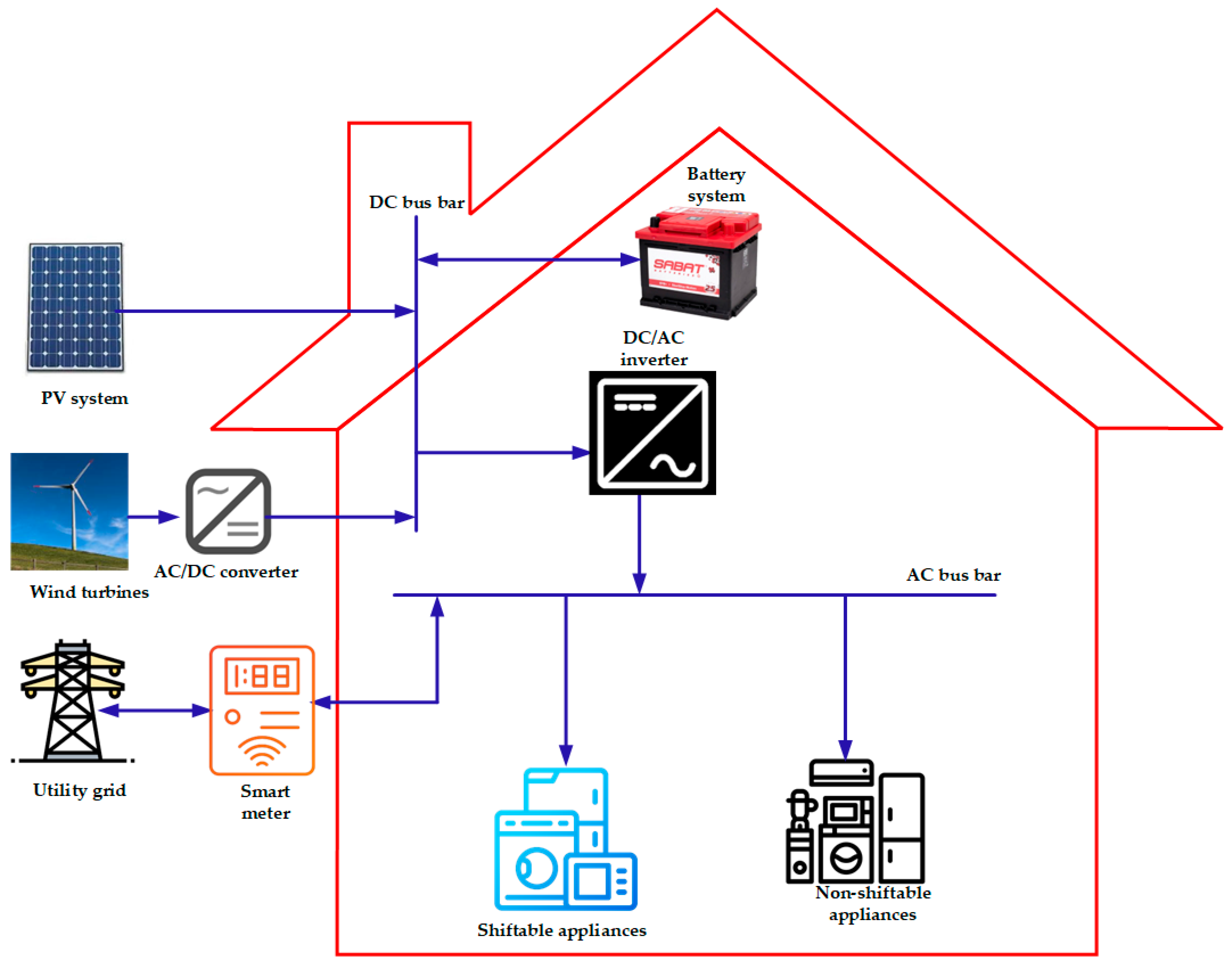 - Han, B.; Zahraoui, Y.; Mubin, M.; Mekhilef, S.; Seyedmahmoudian, M.; Stojcevski, A. Home energy management systems: A review of the concept, architecture, and scheduling strategies. IEEE Access 2023, 11, 19999–20025. [Google Scholar] [CrossRef]