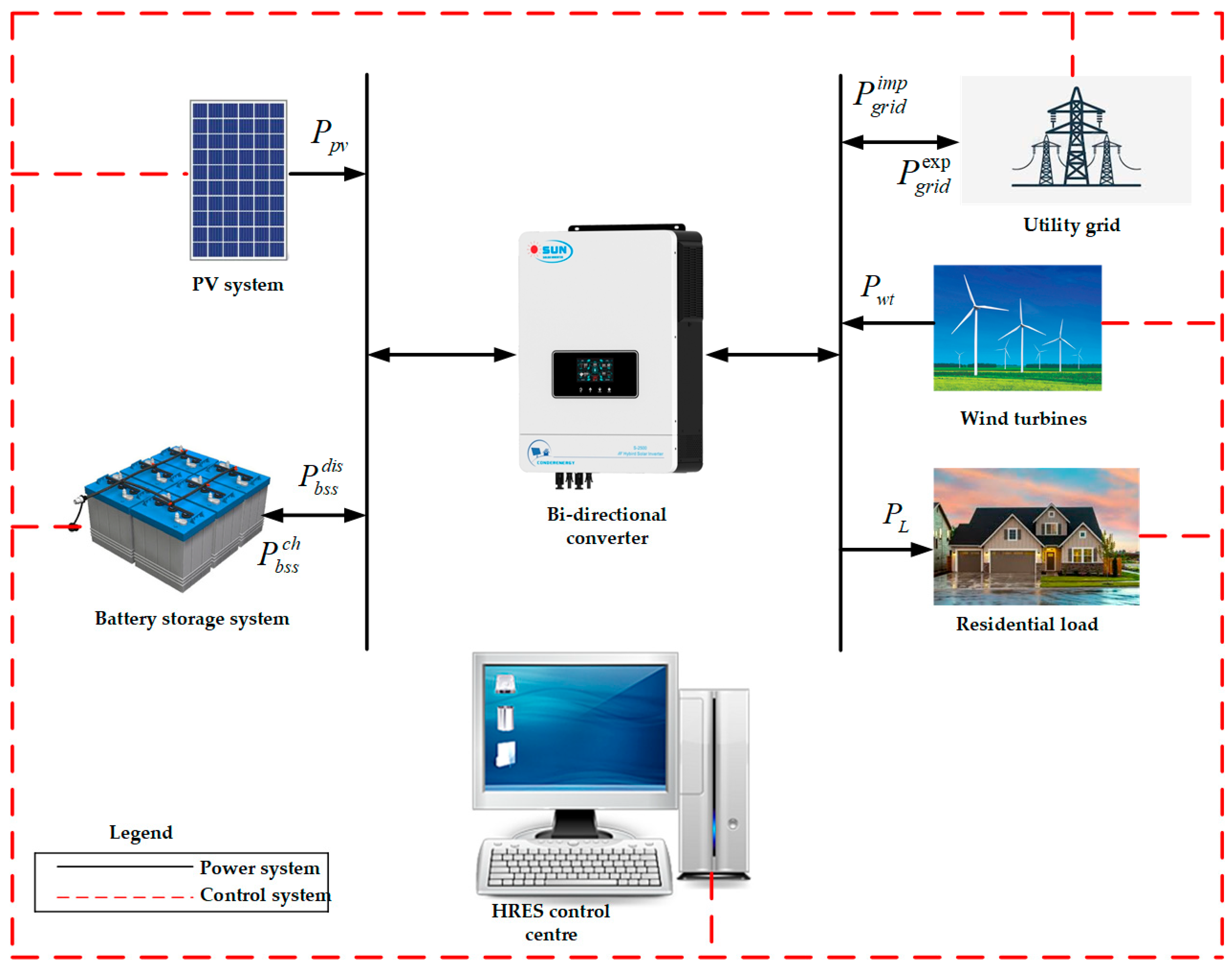 | Grid-connected HRES [42] | ✓ | ✓ | ✓ | ✓ | ✓ | ✕ | ✕ | MPC | Operating costs | Did not cover appliance scheduling |