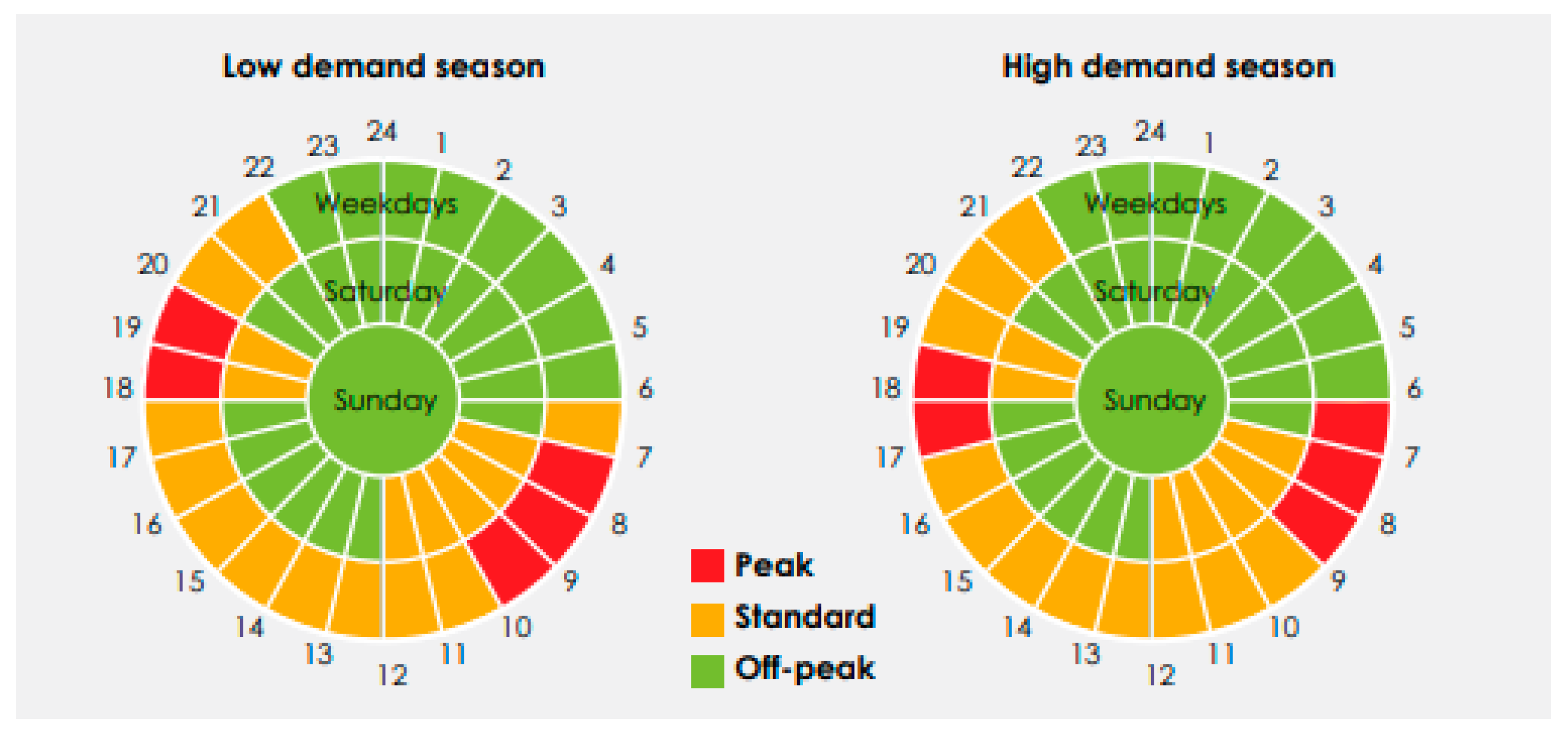 - Liu, J.; Hu, H.; Yu, S.S.; Trinh, H. Electricity pricing and its role in modern smart energy system design: A review. Designs 2023, 7, 76. [Google Scholar] [CrossRef]