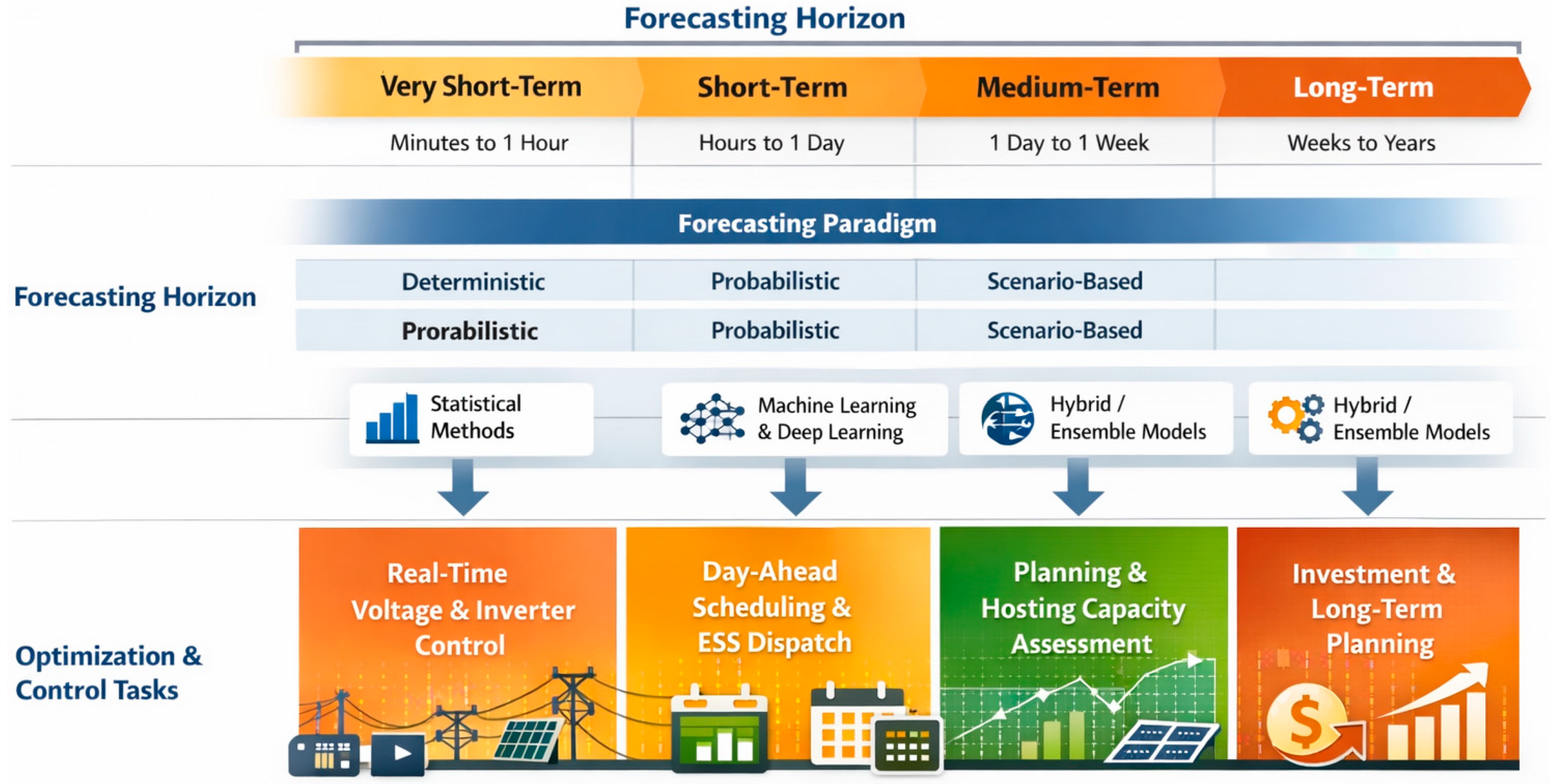 | LTF | Weeks → Years | Network planning; PV/ESS siting and sizing; capacity expansion; policy evaluation. |