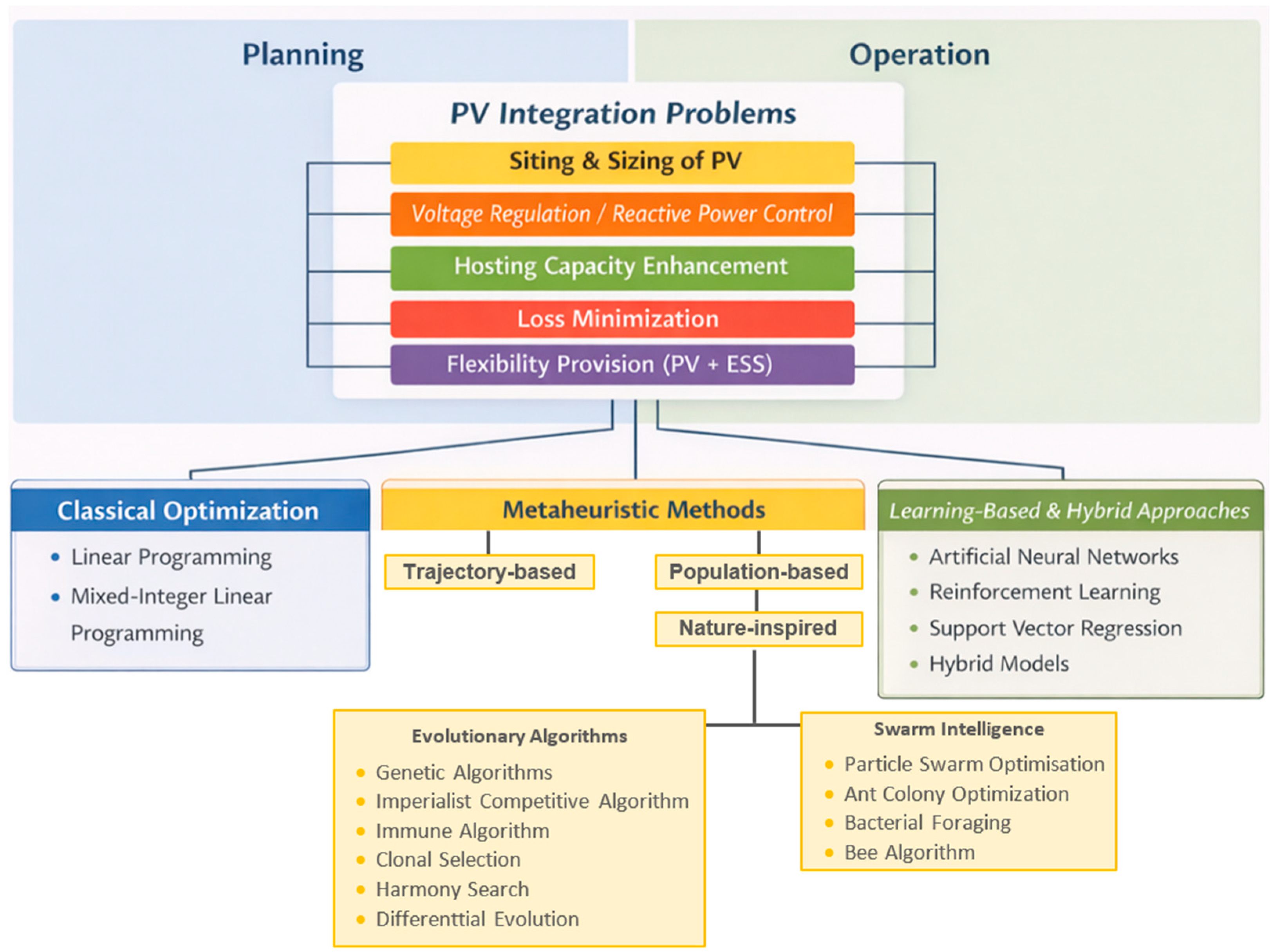 - Optimisation techniques for PV siting, sizing, and operational integration;