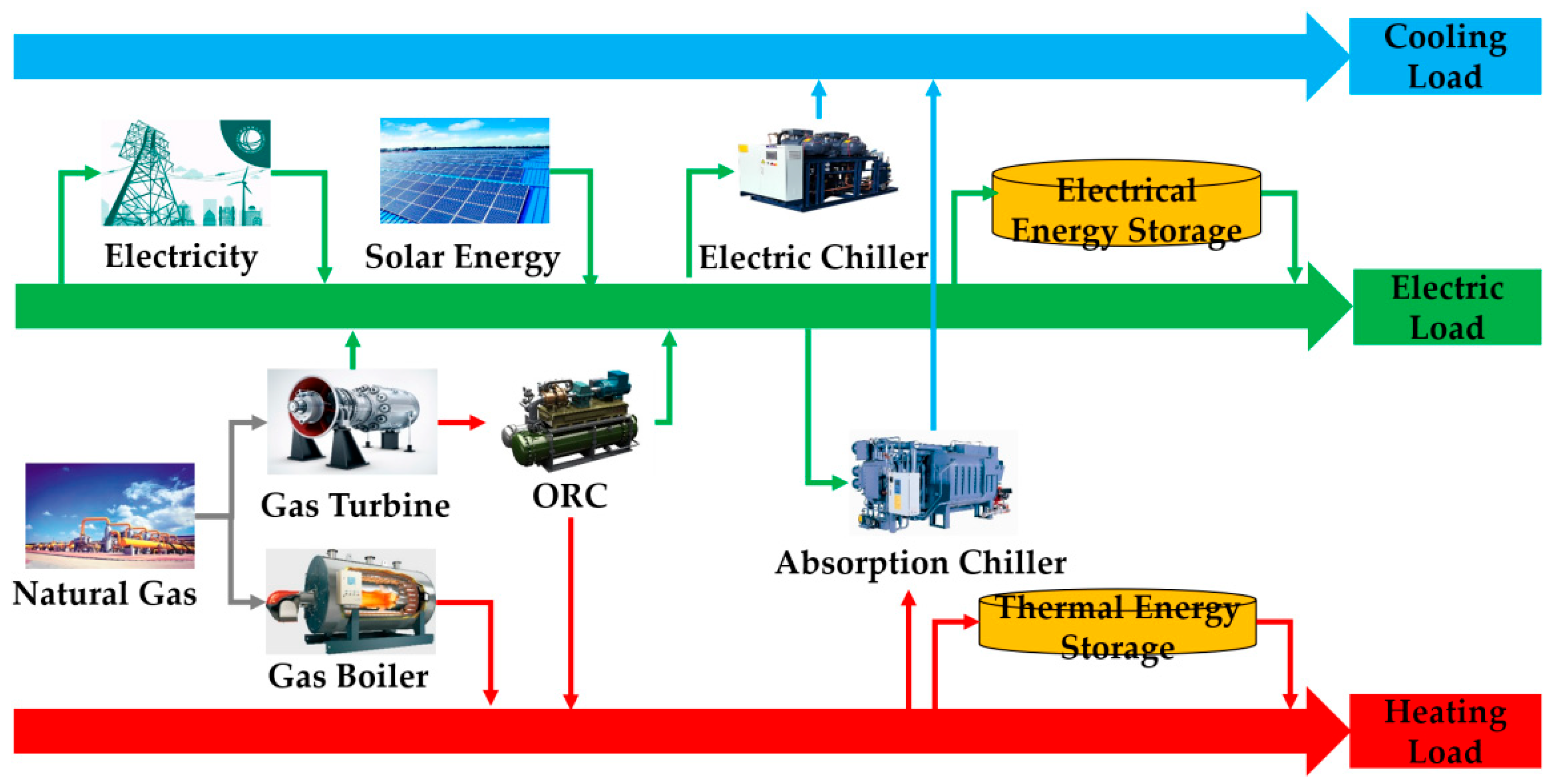 - Yang, G.; Zhai, X.Q. Optimization and performance analysis of solar hybrid CCHP systems under different operation strategies. Appl. Therm. Eng. 2018, 133, 327–340. [Google Scholar] [CrossRef]