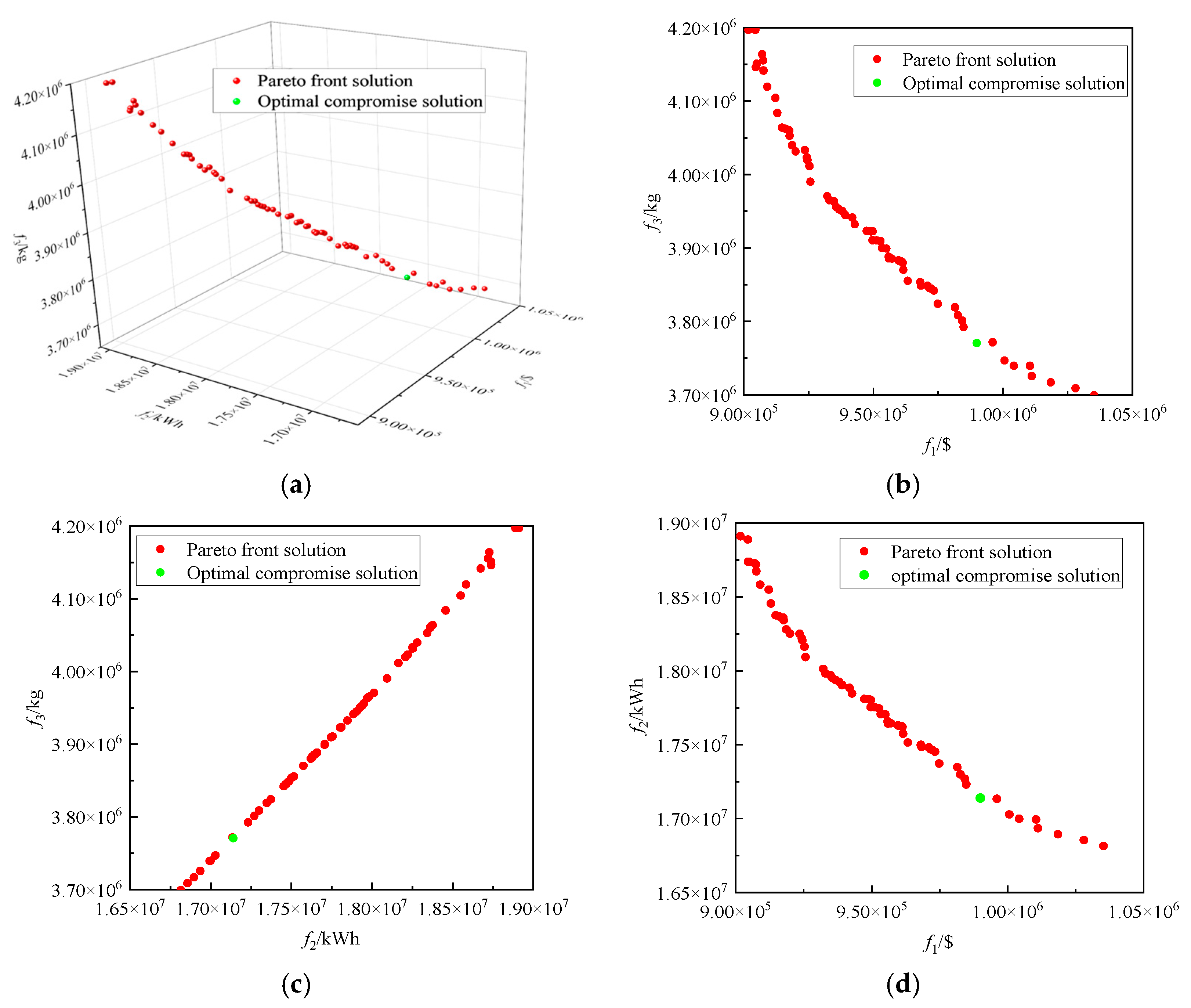 - Bi-Level Optimization Model and Process: A bi-level optimization model was developed, and the optimization procedure was described. The feasibility of the optimization methodology was validated. The decision variables, objective functions, and constraints for both levels of the optimization model were introduced. An interaction exists between the levels: the upper-level model performs capacity planning optimization, while the lower-level model performs dispatch optimization. The planning solution obtained from the upper level serves as input parameters for the lower-level optimization, and the dispatch solution from the lower level is used to calculate the fitness value for the upper-level planning model. Finally, the TOPSIS was applied to the Pareto front solutions to determine the system’s optimal planning solution.