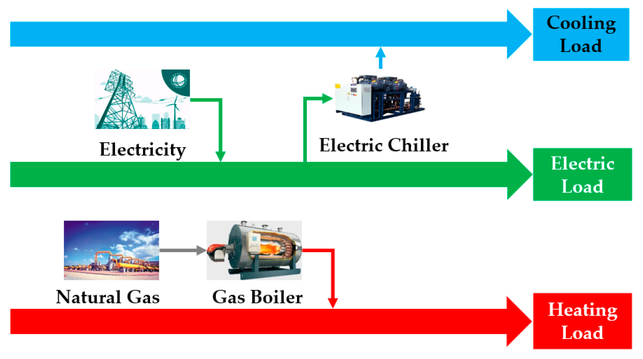 - Wei, D.; Chen, A.; Sun, B.; Zhang, C. Multi-objective optimal operation and energy coupling analysis of combined cooling and heating system. Energy 2016, 98, 296–307. [Google Scholar] [CrossRef]