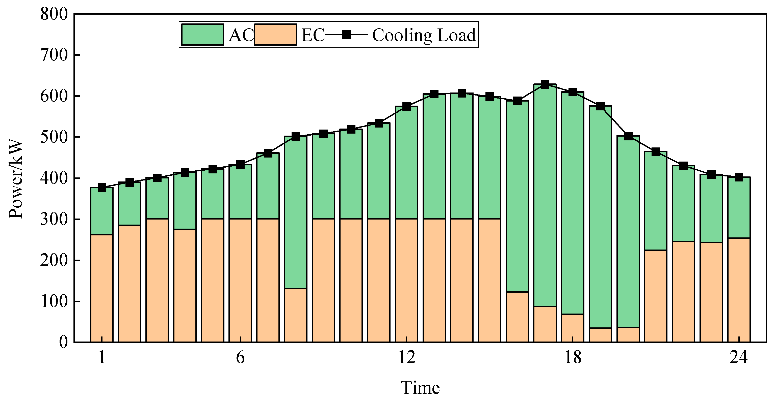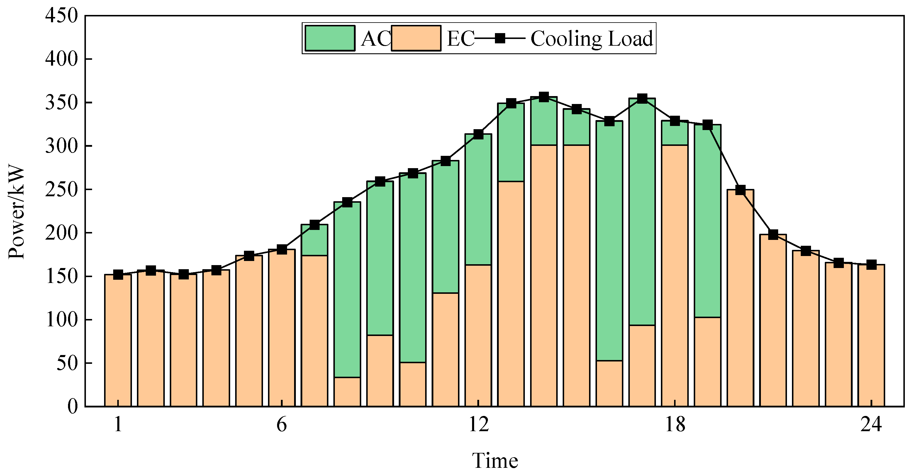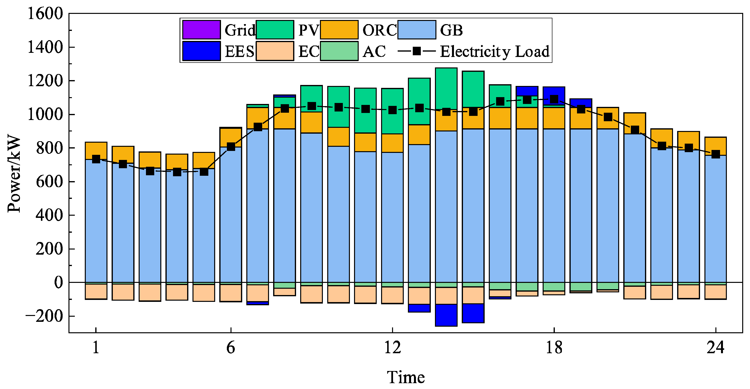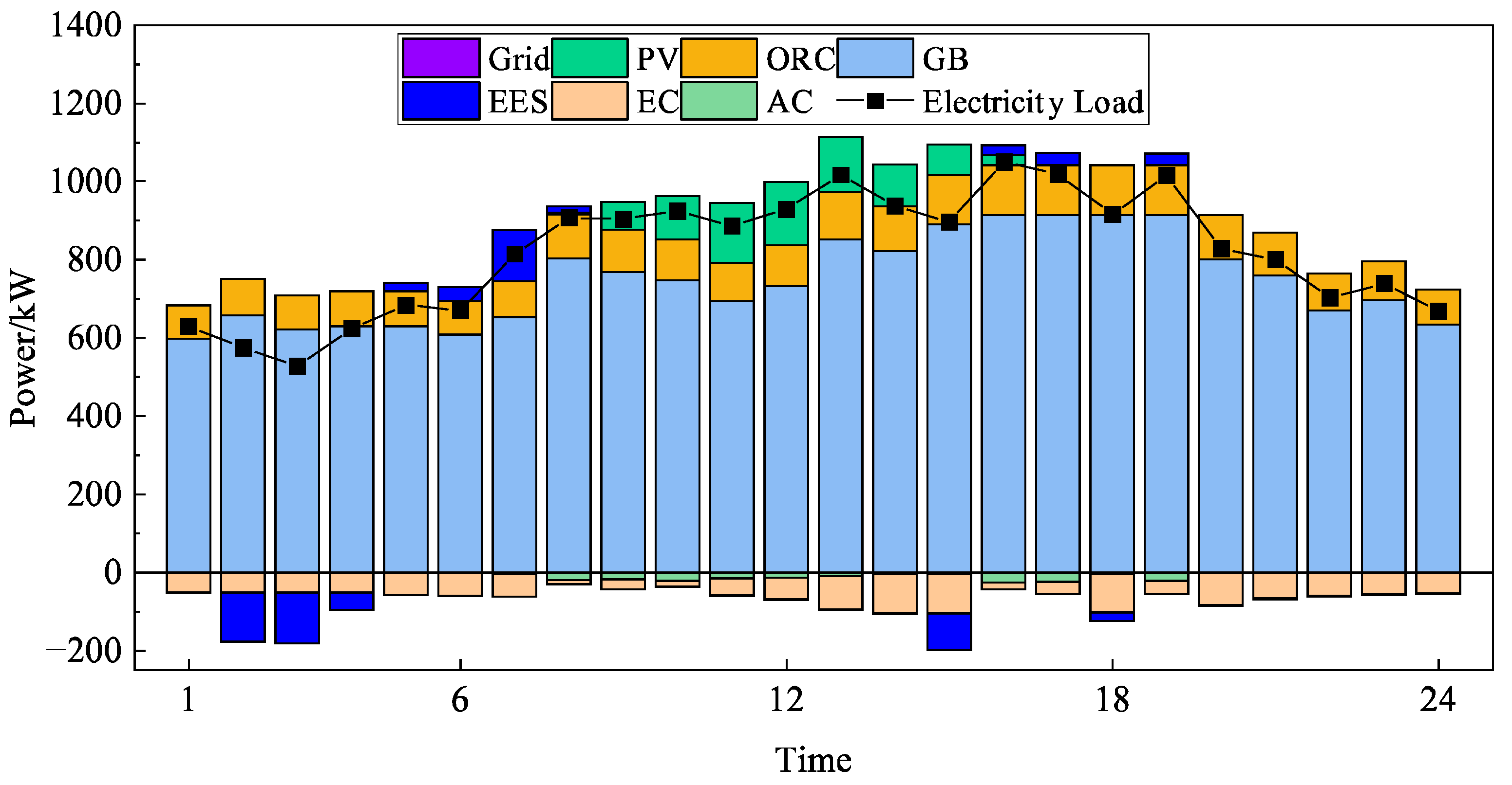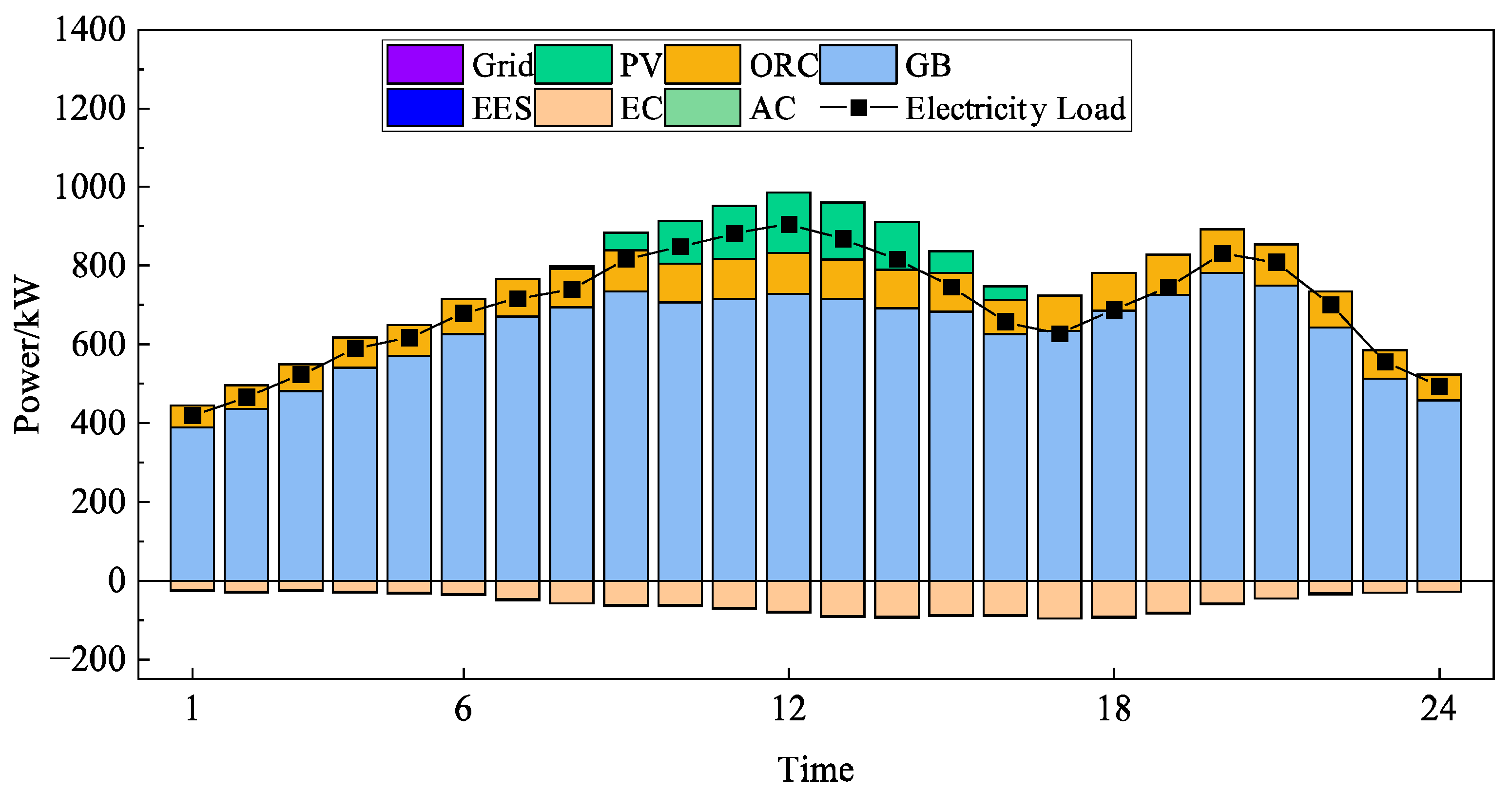- System Framework and Equipment Models: The framework of the LC-DARS-based IES was constructed, and the physical models for each key component were established. These models include: PV panels, CHP unit, AC (LC-DARS), GB, EC, grid interaction, TES, and EES devices.