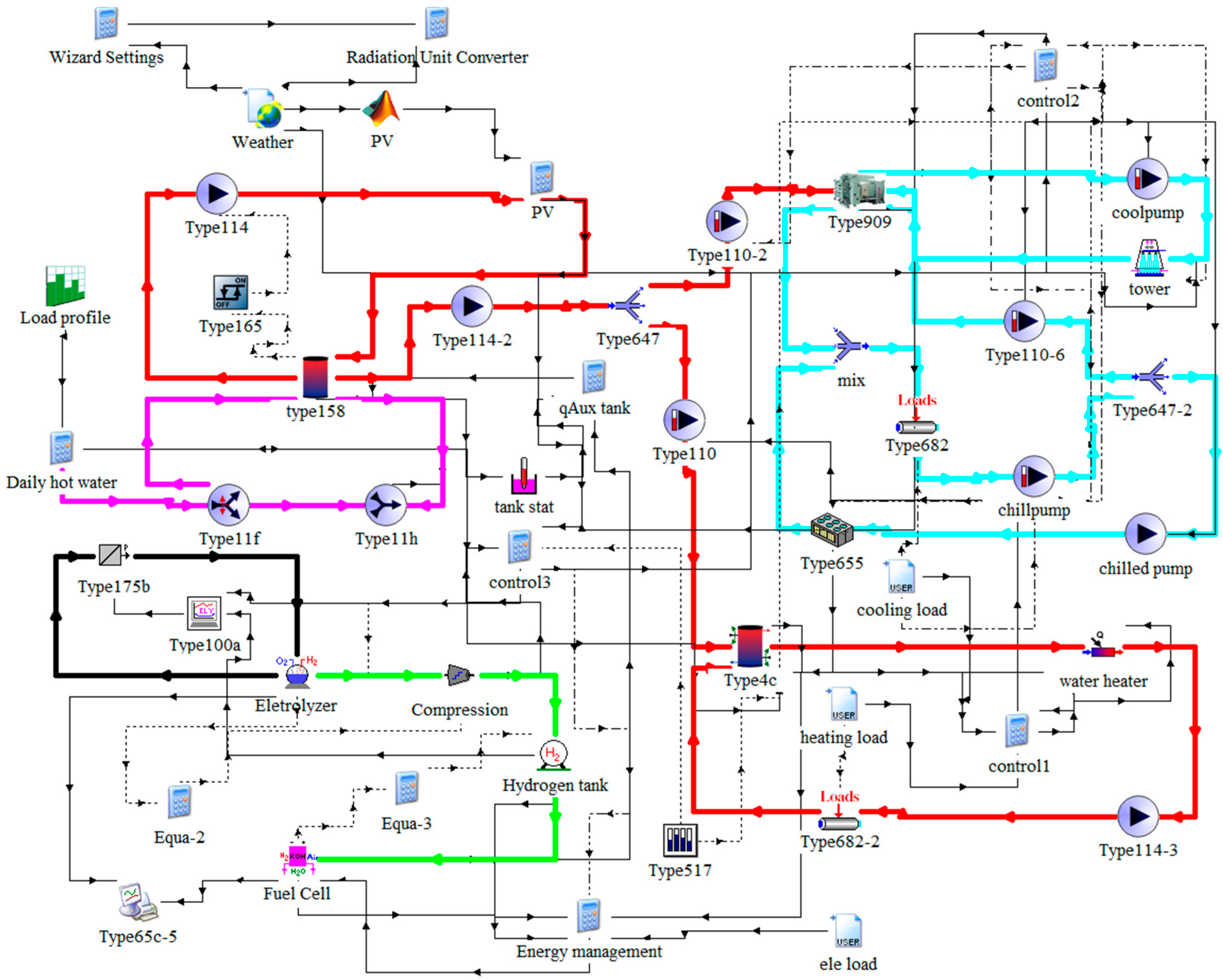 | Evaporative refrigeration | Type655 | Utilize electricity to provide cooling for building | Electrolyzer | Type160 | Electrolyze surplus electricity into hydrogen |